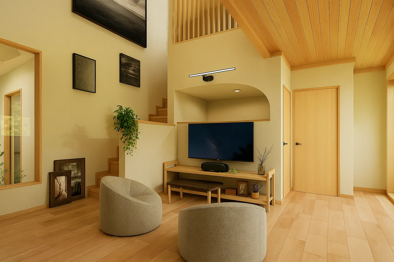 テレビを設置している壁の裏は、階段下のワークスペースとしました。