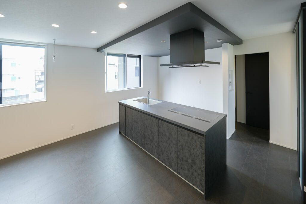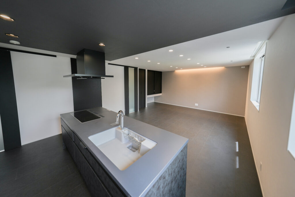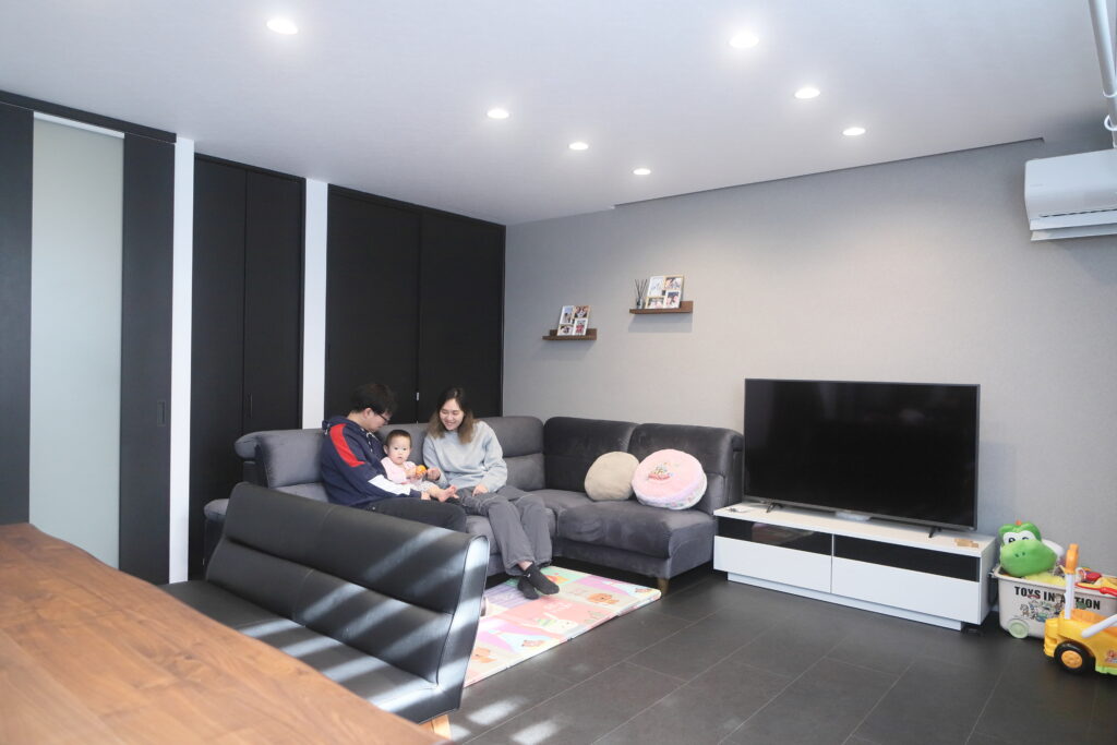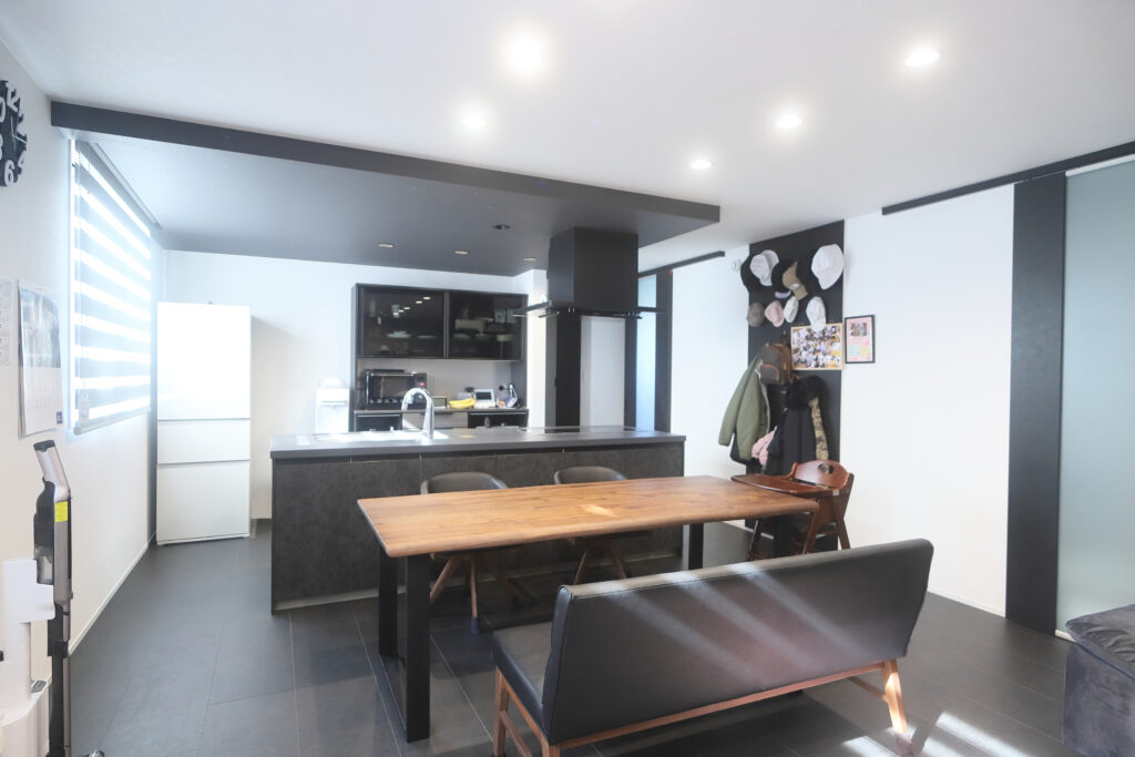 奥様:LDKです。せっかく家を建てるのなら他の家と被りたくないと考え、ホテルライクな空間をイメージしました。床と扉は黒、壁は白、アクセントクロスはグレーと、モノトーン3色でまとめています。