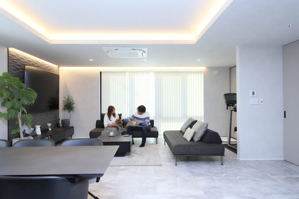 ホテルライクな空間を理想としていたので、LDKの床は大理石調のグレーのフロアタイルを敷きました。