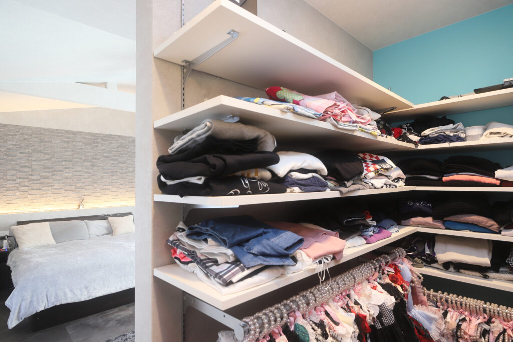 ウォークインクローゼットはスペースを広めにとり、さらに棚を付けたので、服の管理がとてもしやすいです。
