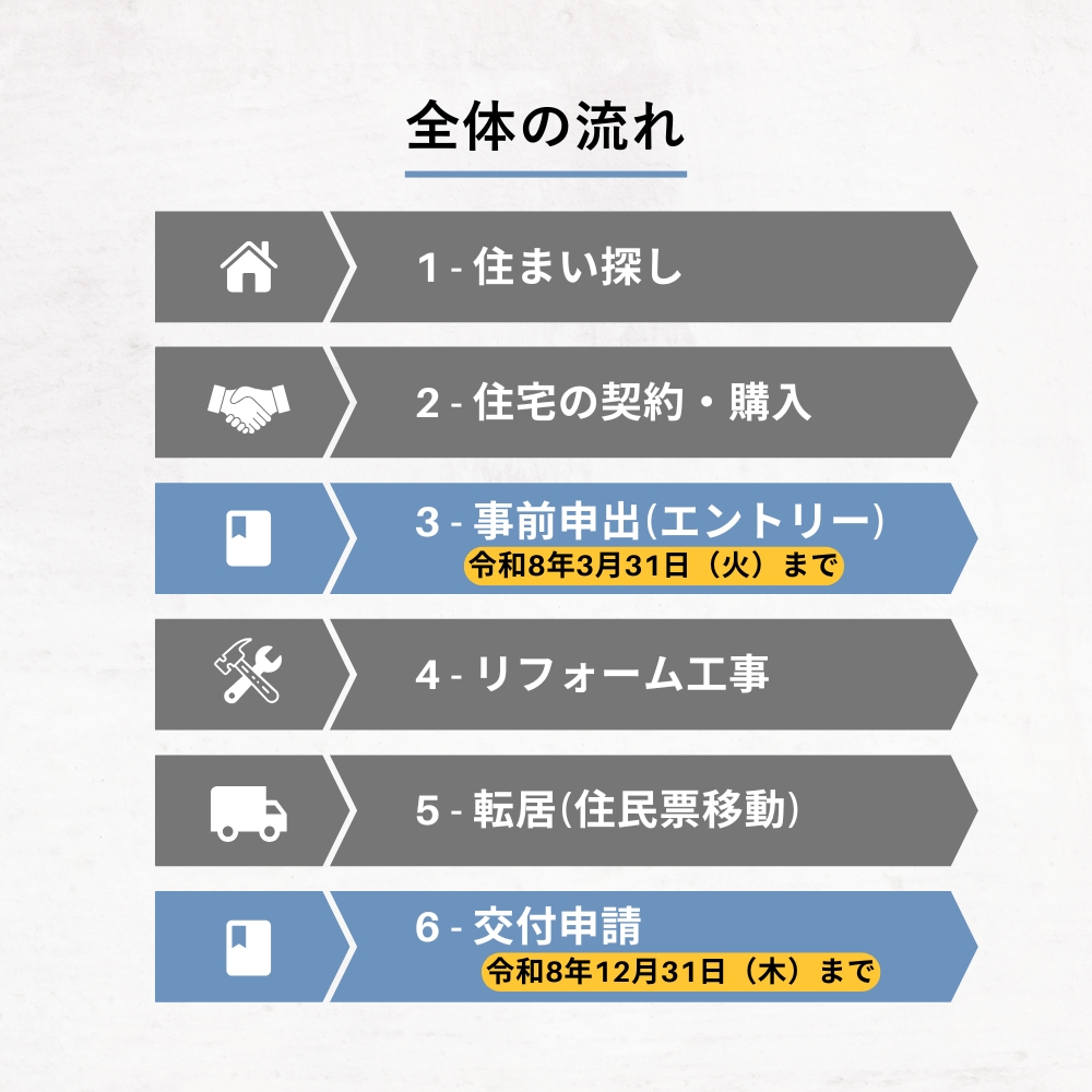 令和6年度(2024年度)に事前申出(エントリー)を済ませた方は、交付申請の締切が令和7年12月31日(水)までとなっています。お間違いのないようご注意ください。