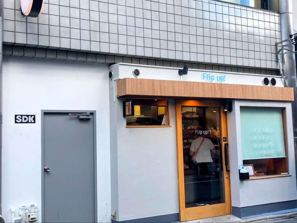 Flip up!(フリップアップ)は、行列ができる大人気のパン屋さん。2025年2月には六角通に2号店もオープンしました。写真は押小路通にある本店で、小さな店舗ですが、いつも朝からたくさんの人が訪れています。