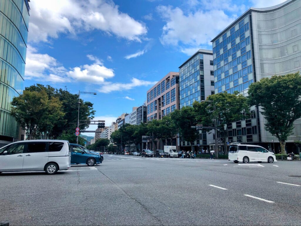 とくに烏丸御池エリアの「碁盤の目」と呼ばれる町並みは、京都ならではの風景です。