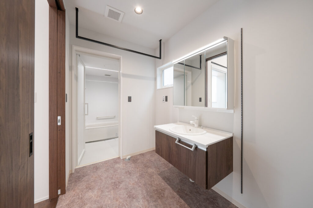 室内干しスペースを設け、広々とした洗面・洗濯・脱衣スペース。