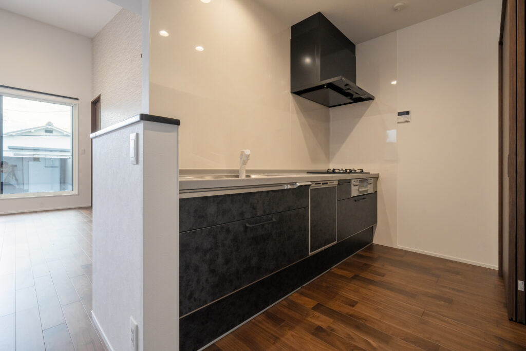 キッチンの背面は全て収納とすることで、生活感が出ないよう工夫しています。