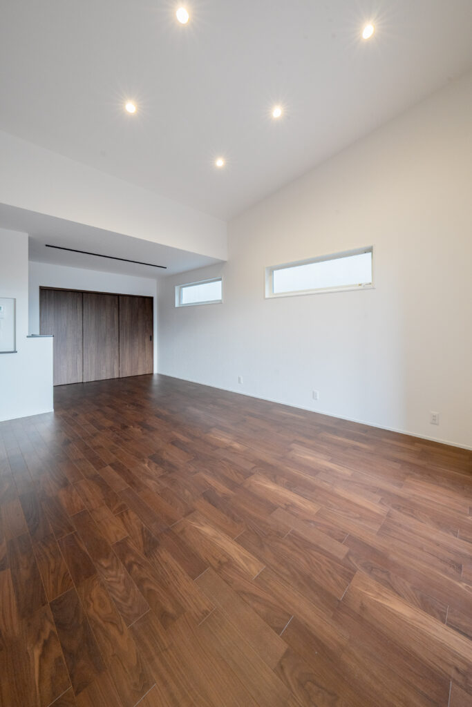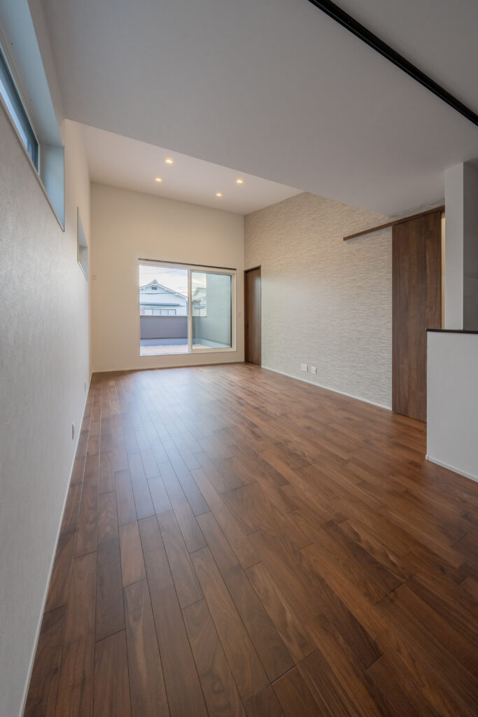 勾配天井として天井を高くすることで、開放感のある広々空間に。