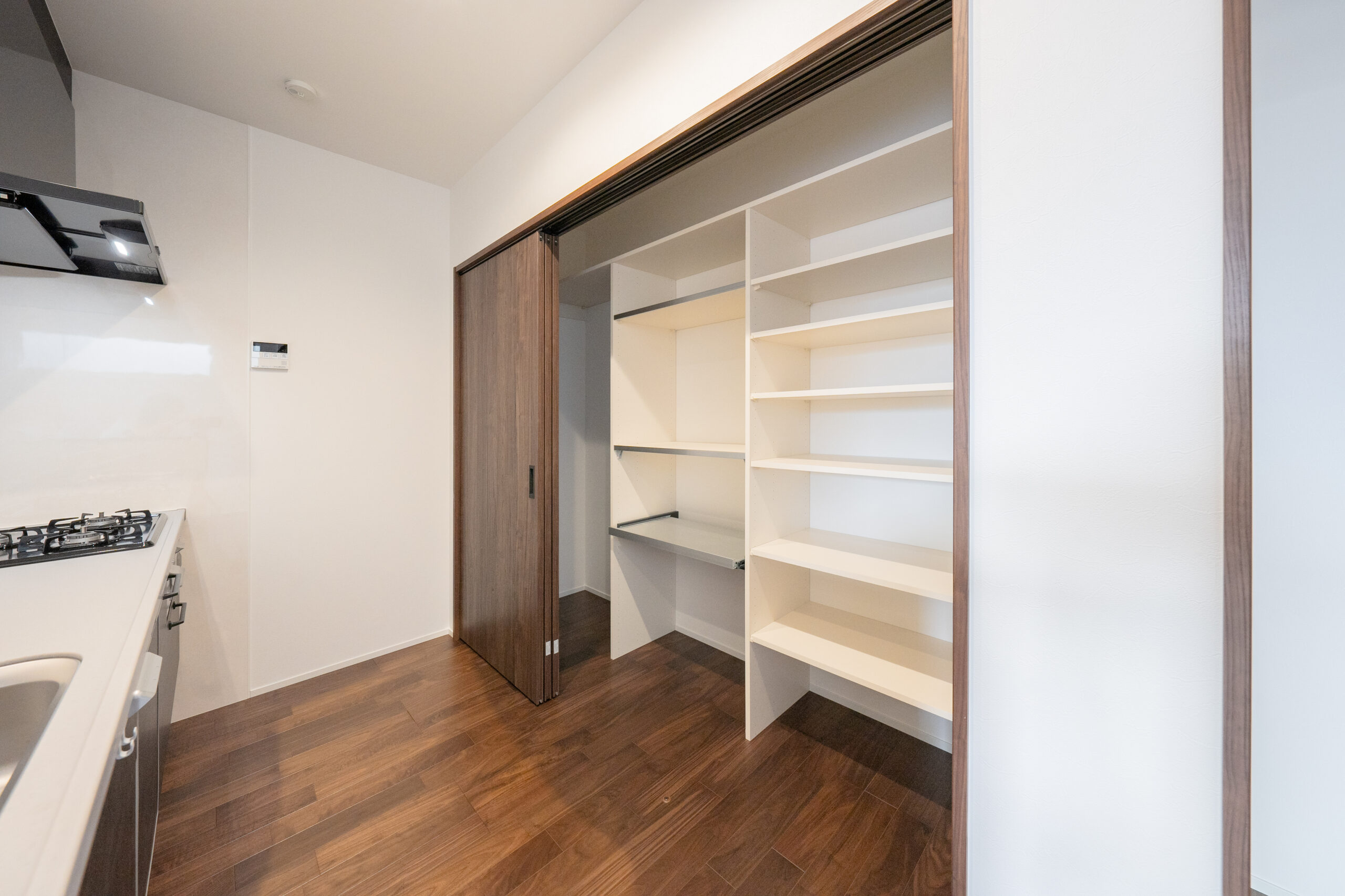 キッチンの背面は全て収納とすることで、生活感が出ないよう工夫しています。