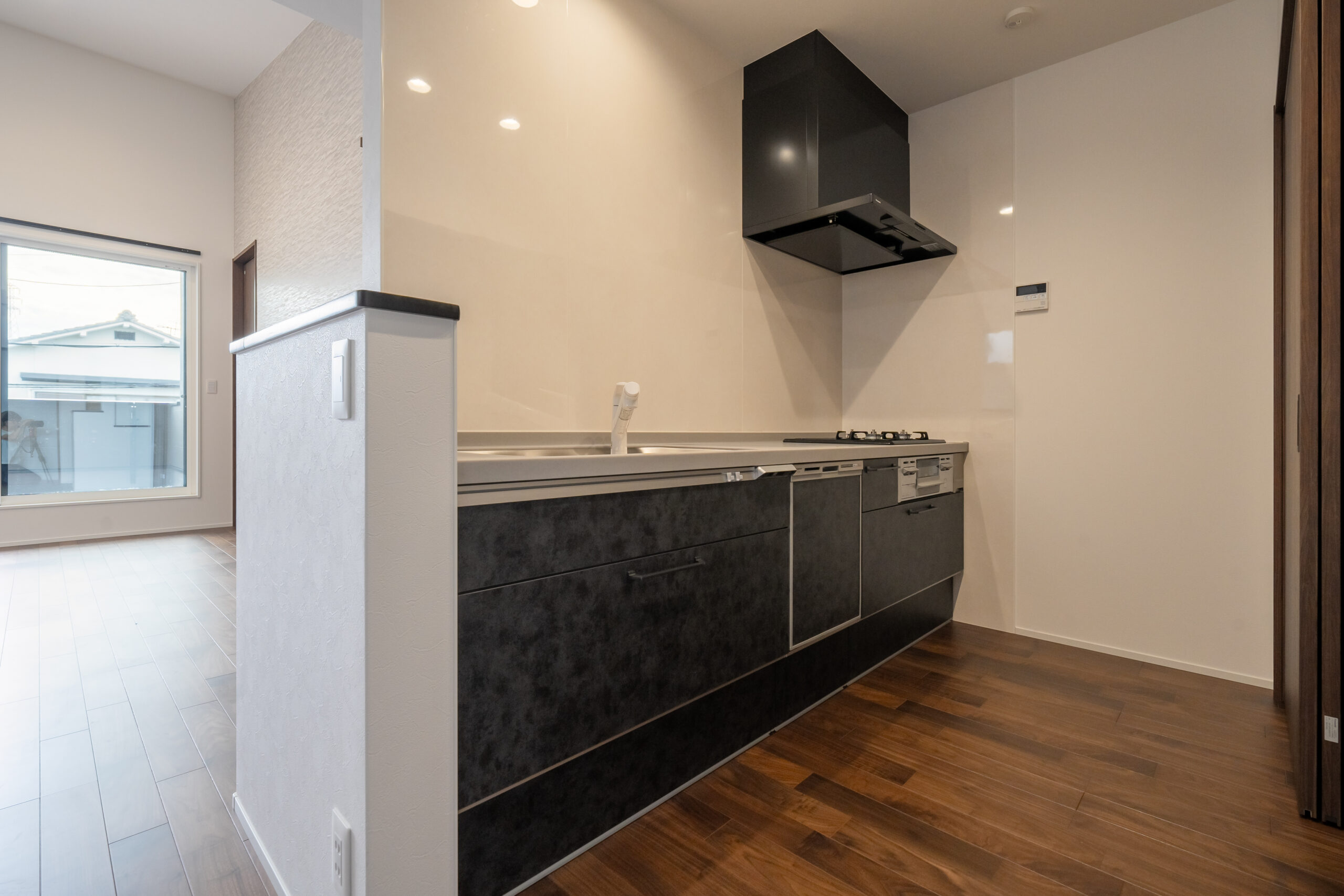 大きな窓から入る光がリビング全体を照らし、キッチンのシンクに向かっている時も気持ちを明るくしてくれます。