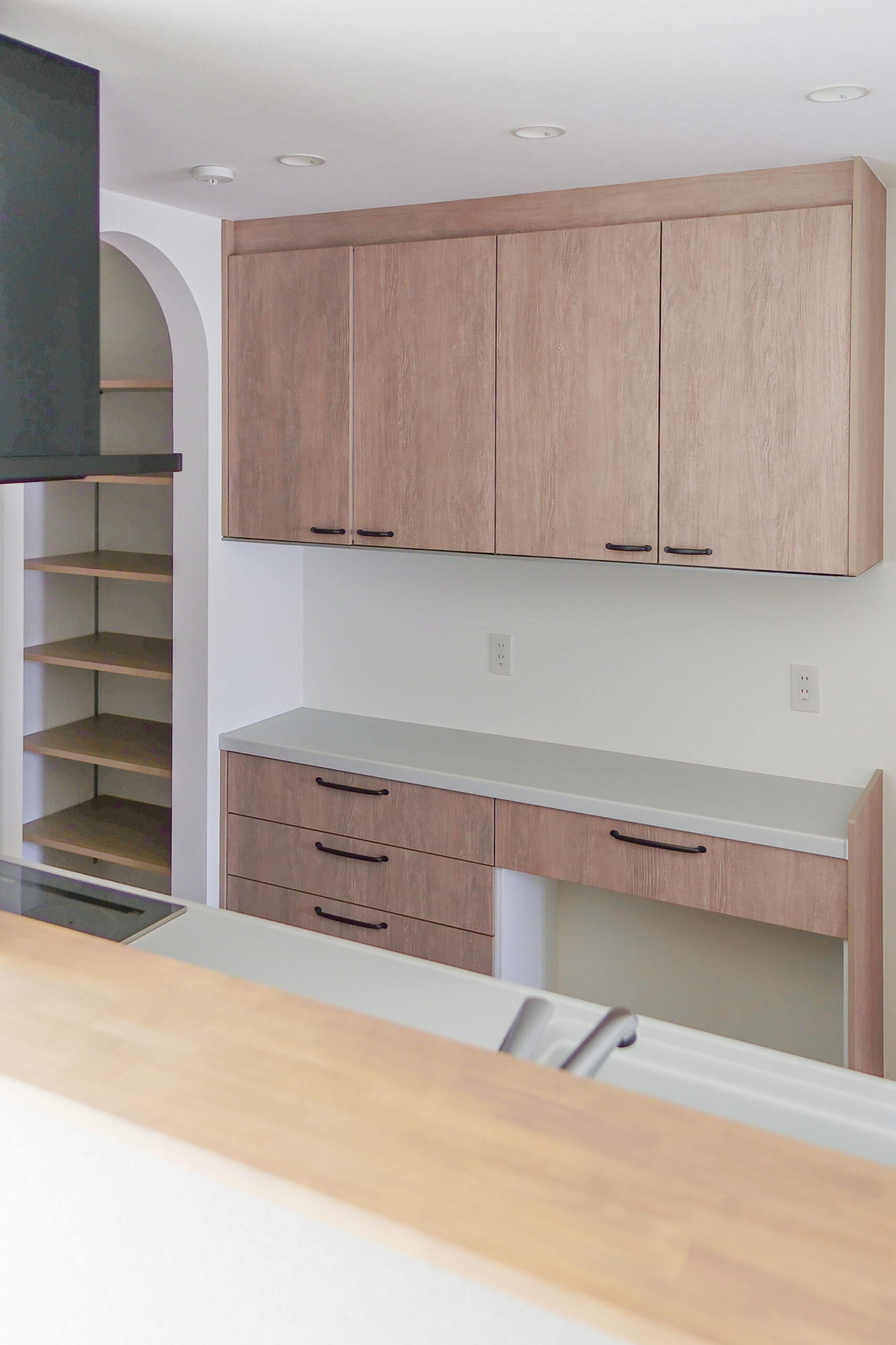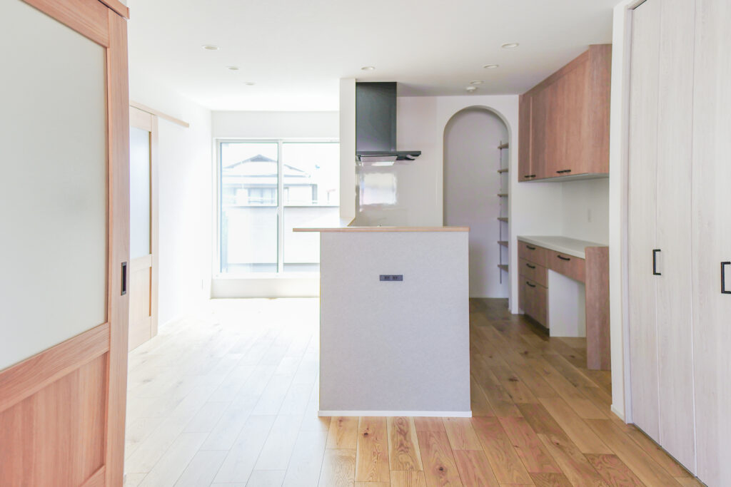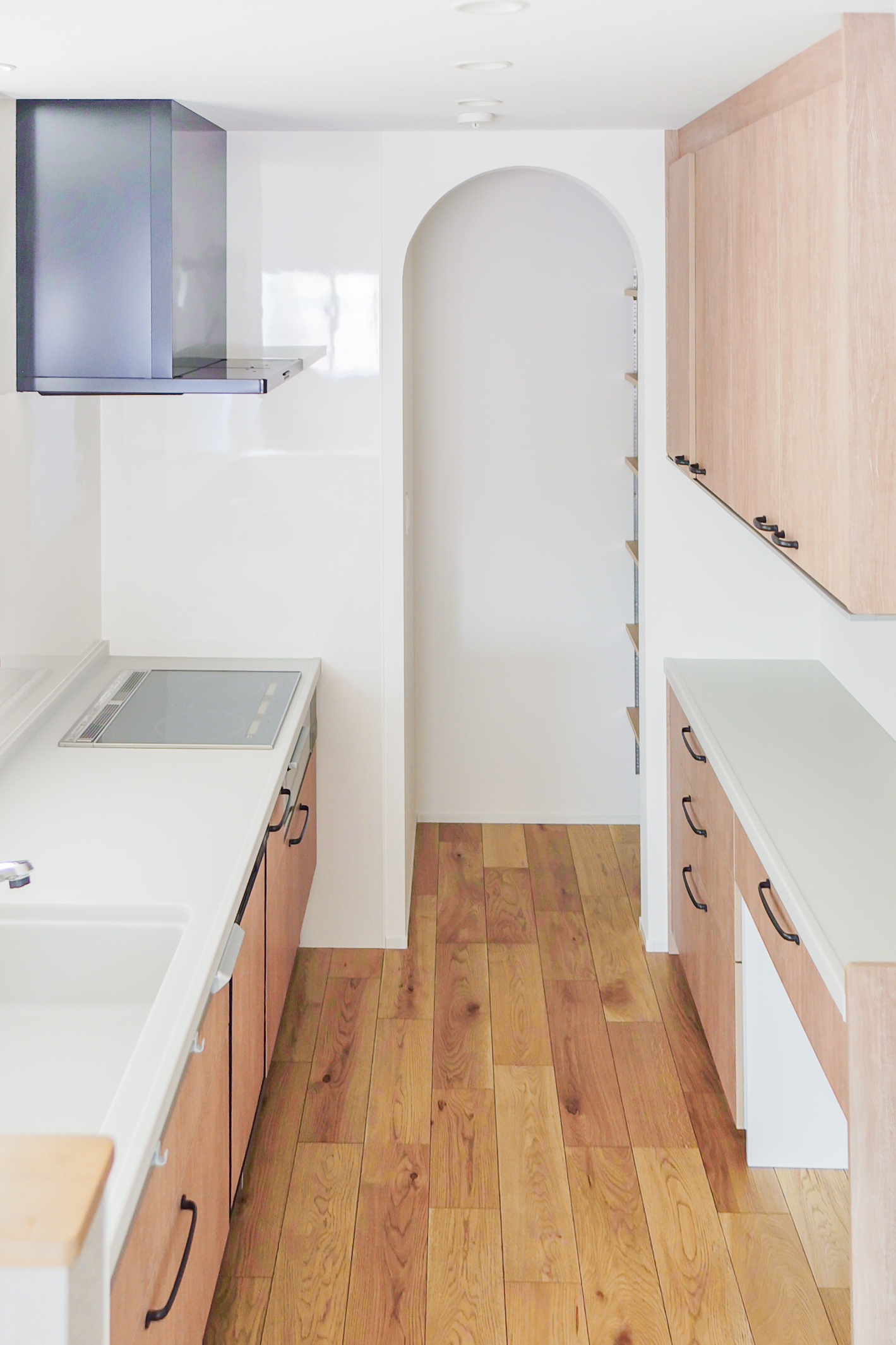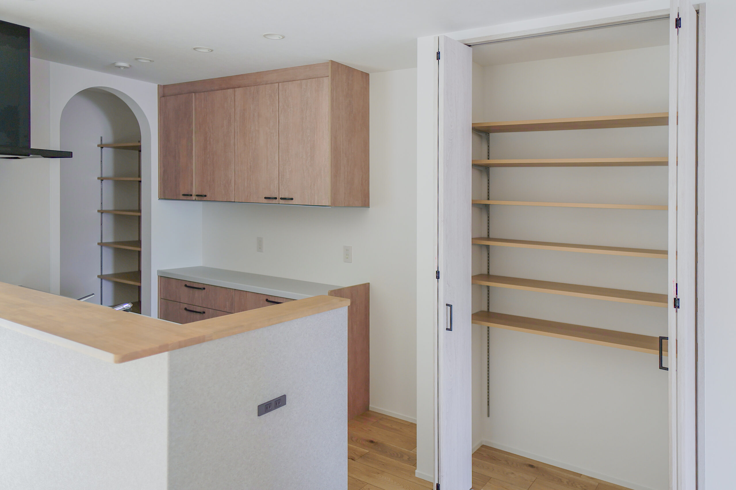 キッチンの奥にはパントリーを設置しており、収納スペースも確保されています。