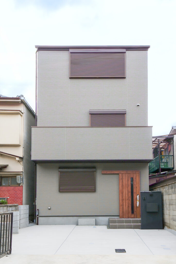 存在感のあるシックな外観。駐車スペースも広く設けられています。