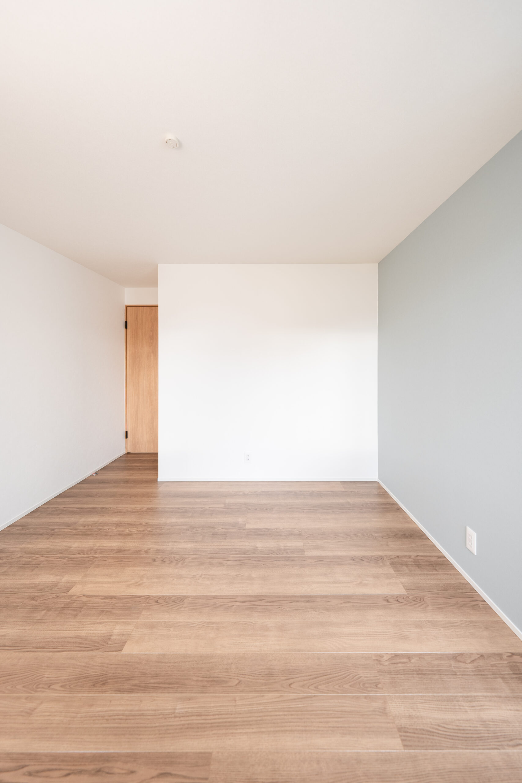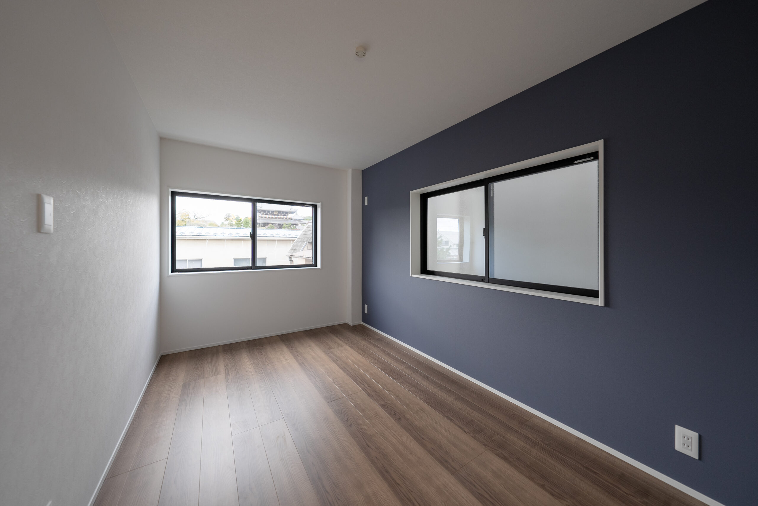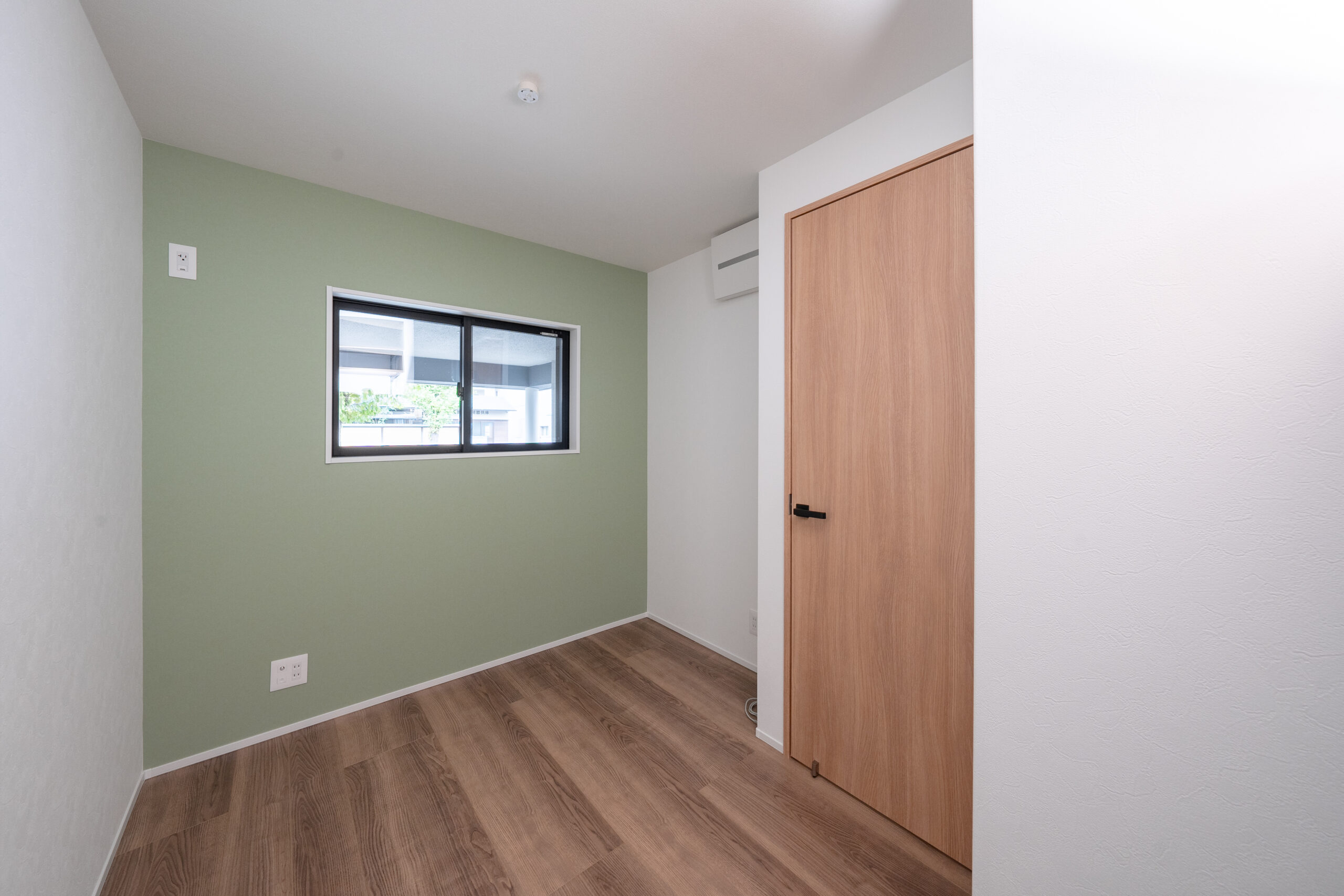 駐車スペースに面した部屋は、ご主人の書斎に。作業効率を上げると言われるグリーンのクロスと窓からの眺めが、気分転換になりそうです。