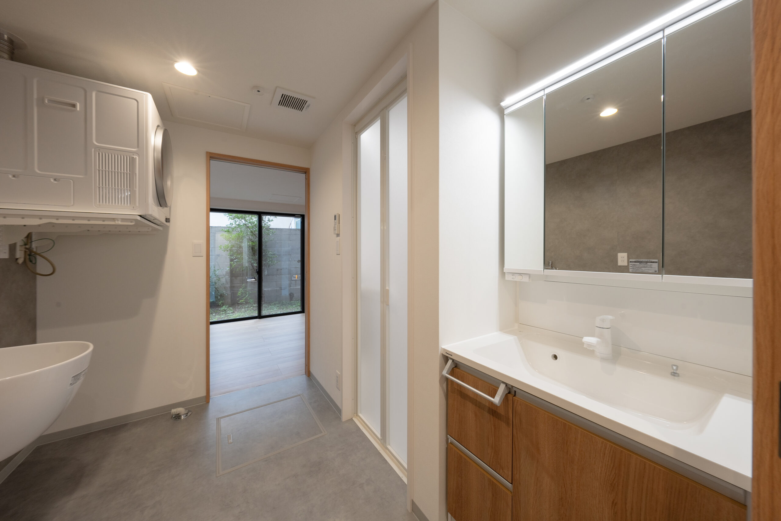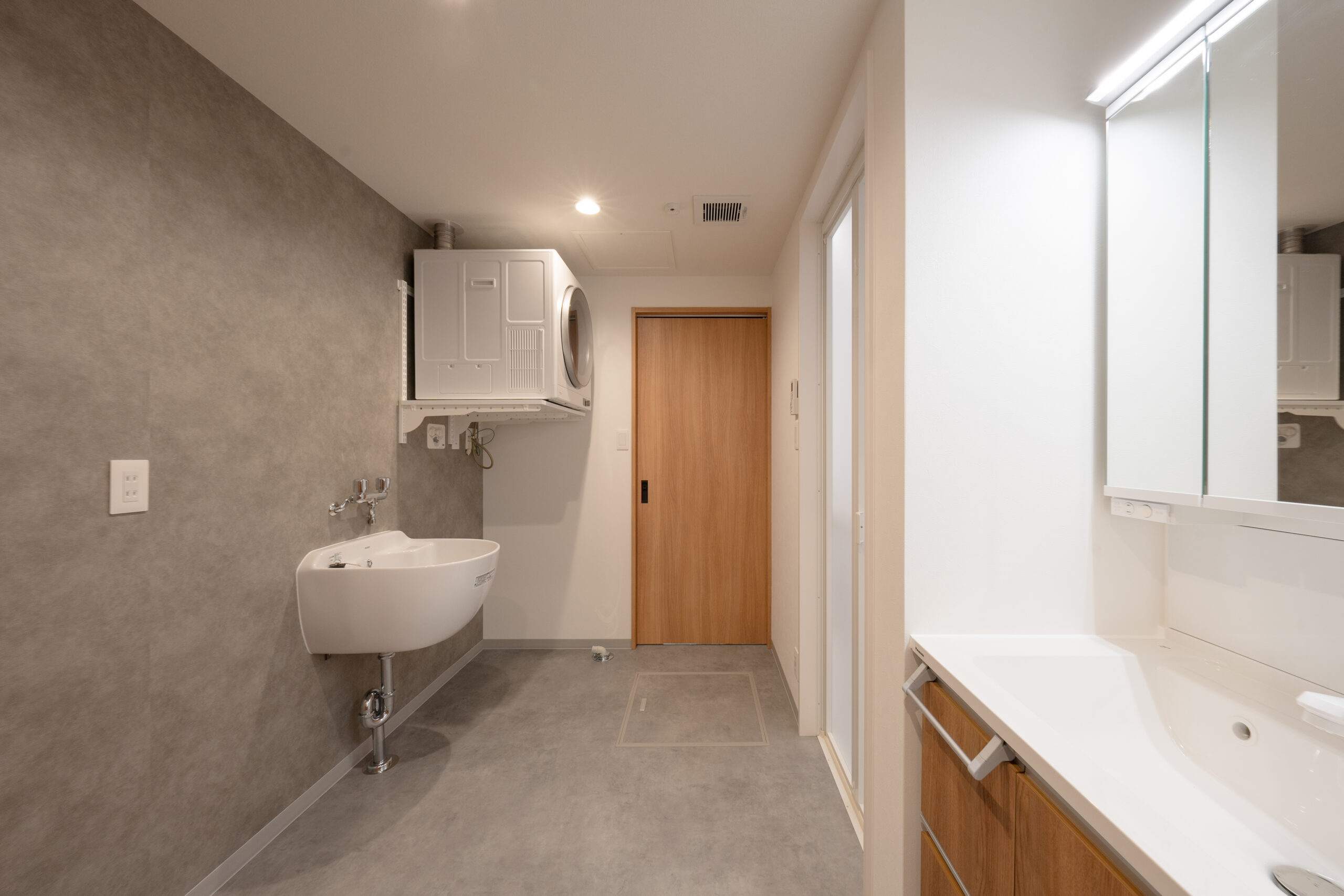 洗濯と洗面所を同時に使用しても混雑しない、広々とした造りです。ガス乾燥機も設置済み。