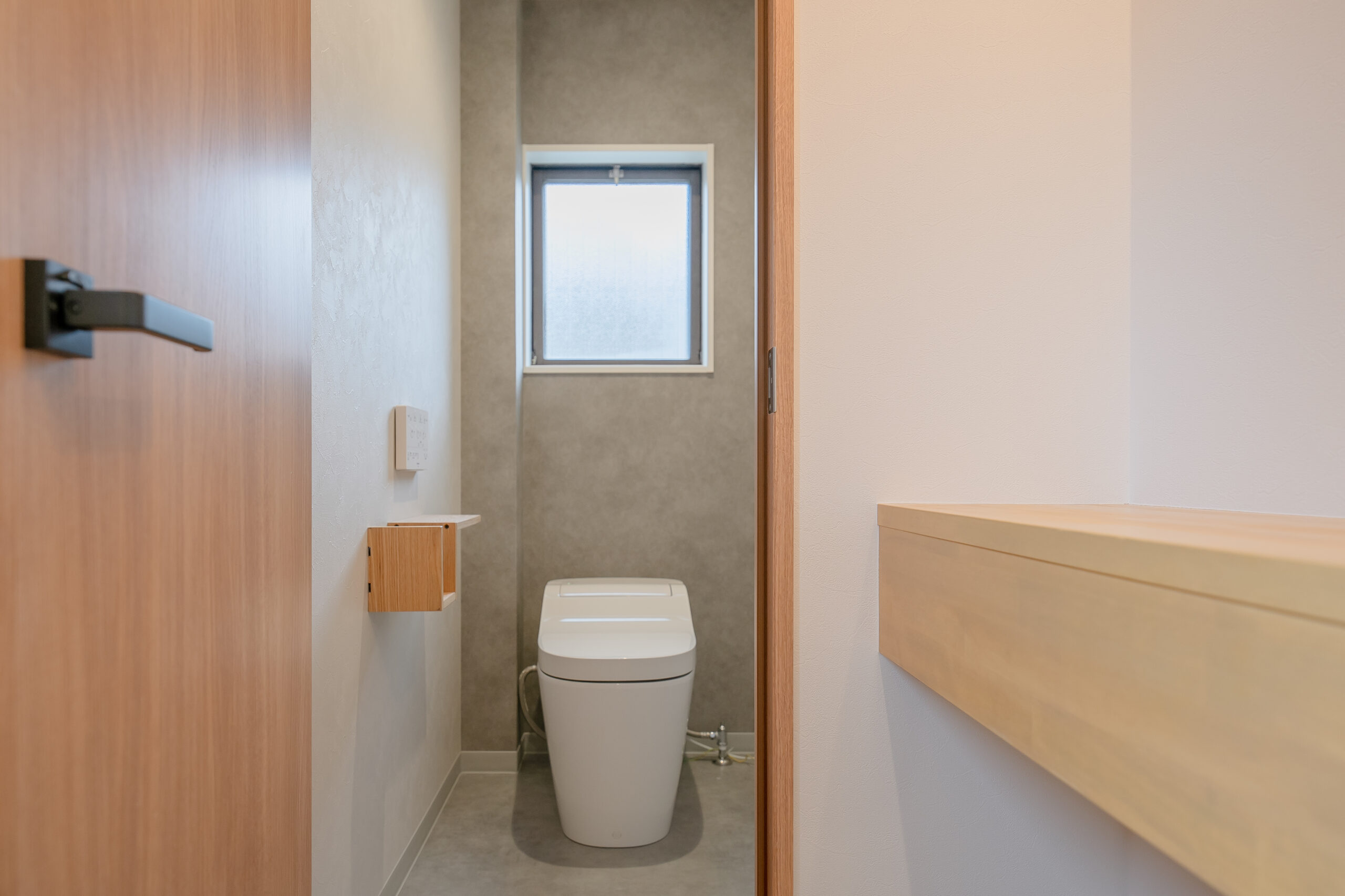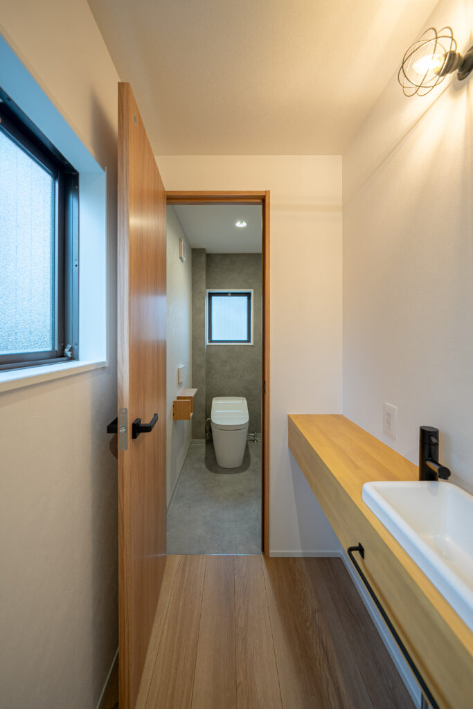 階段を登ってすぐの位置には、独立洗面台とトイレを。