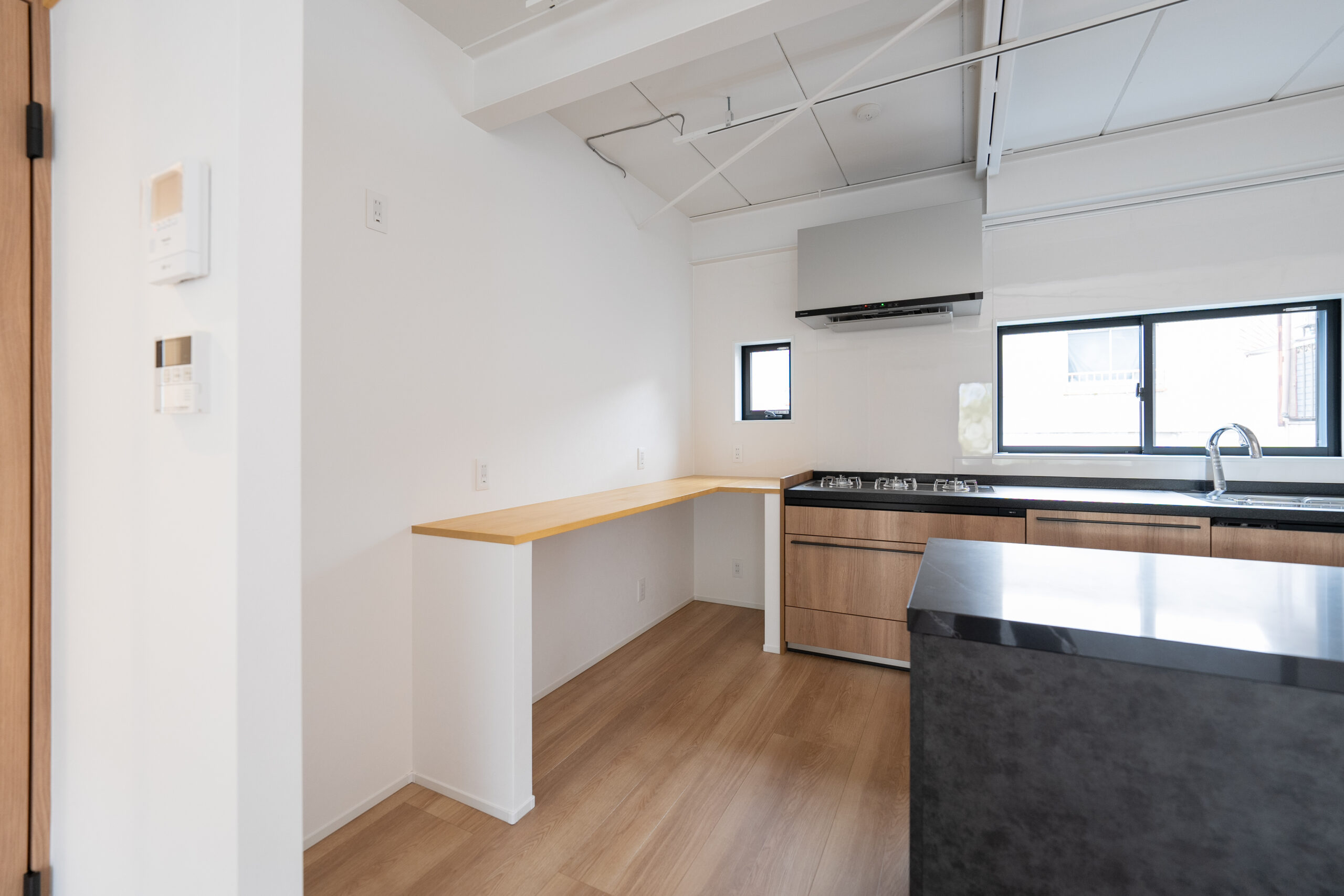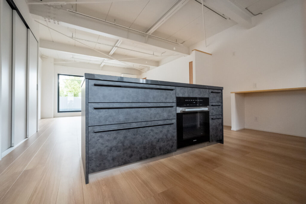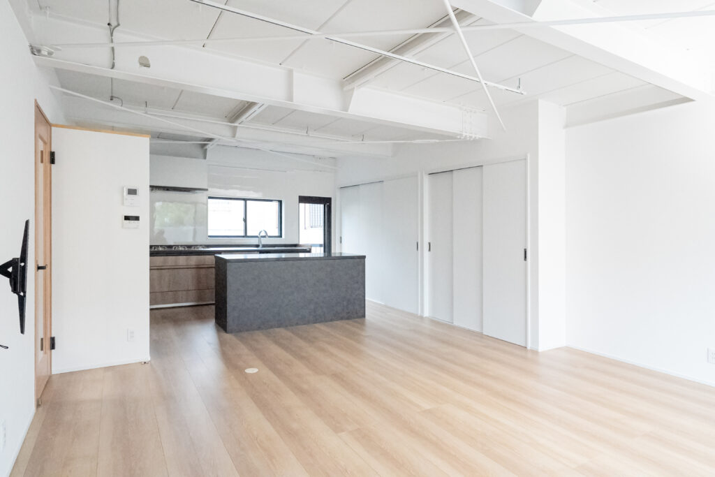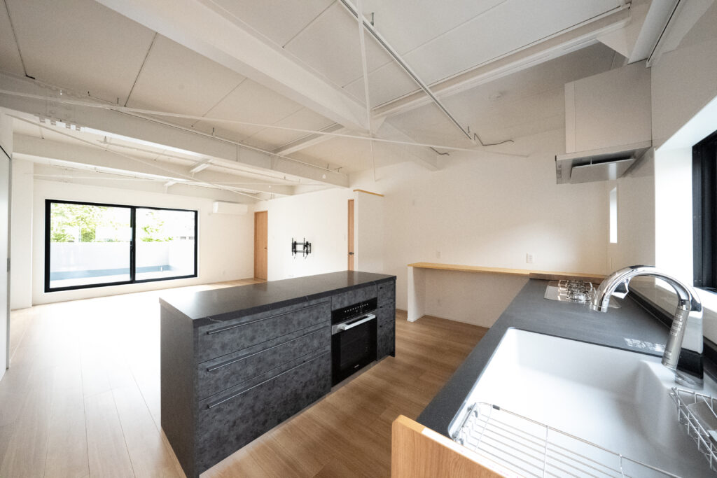 天井の梁を見せ、室内空間を大きく使った抜け感のあるLDK。冷蔵が見えないよう少し壁を設けてあります。