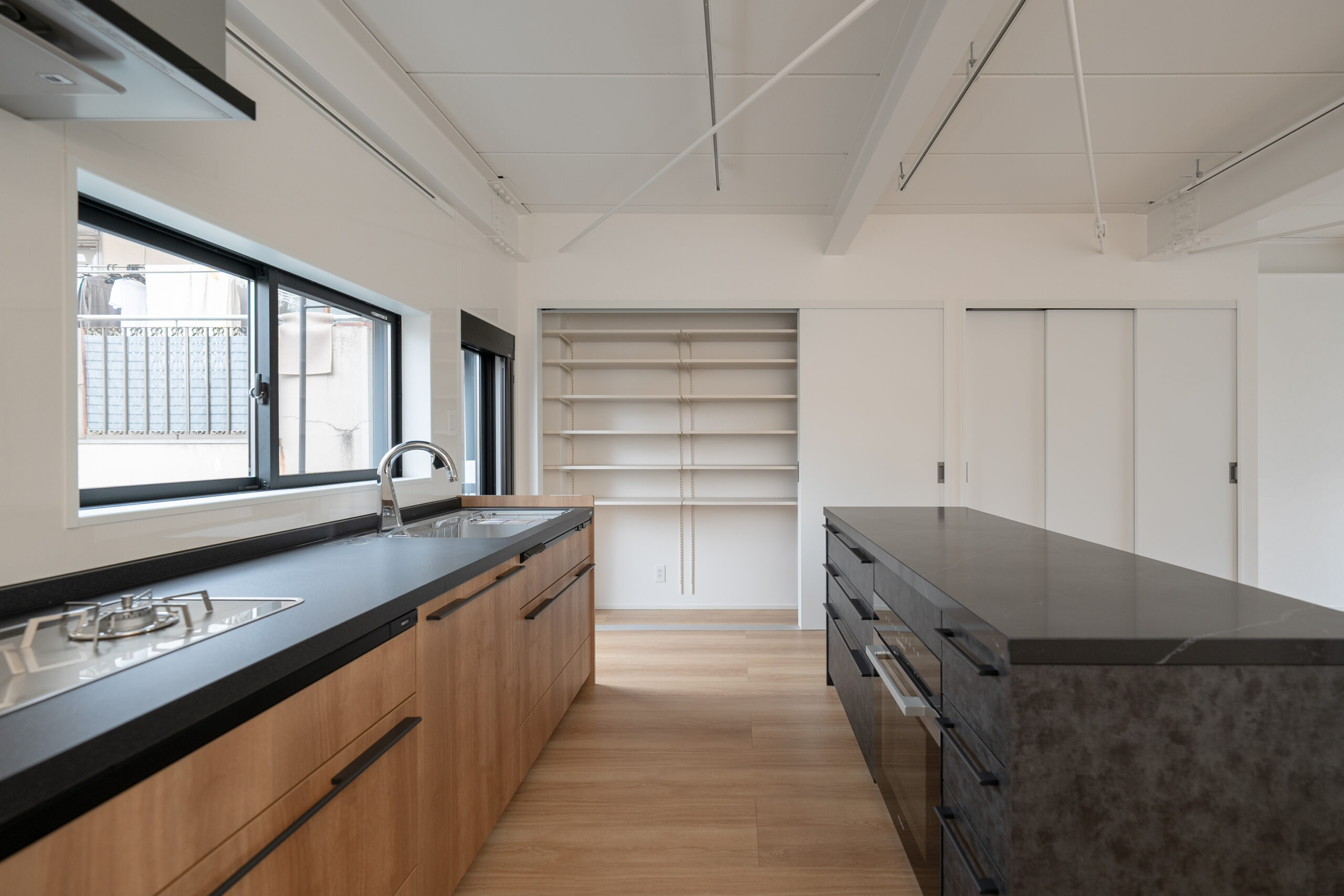 コンロは、大きなお鍋を並べて同時に調理できる横並びを採用。