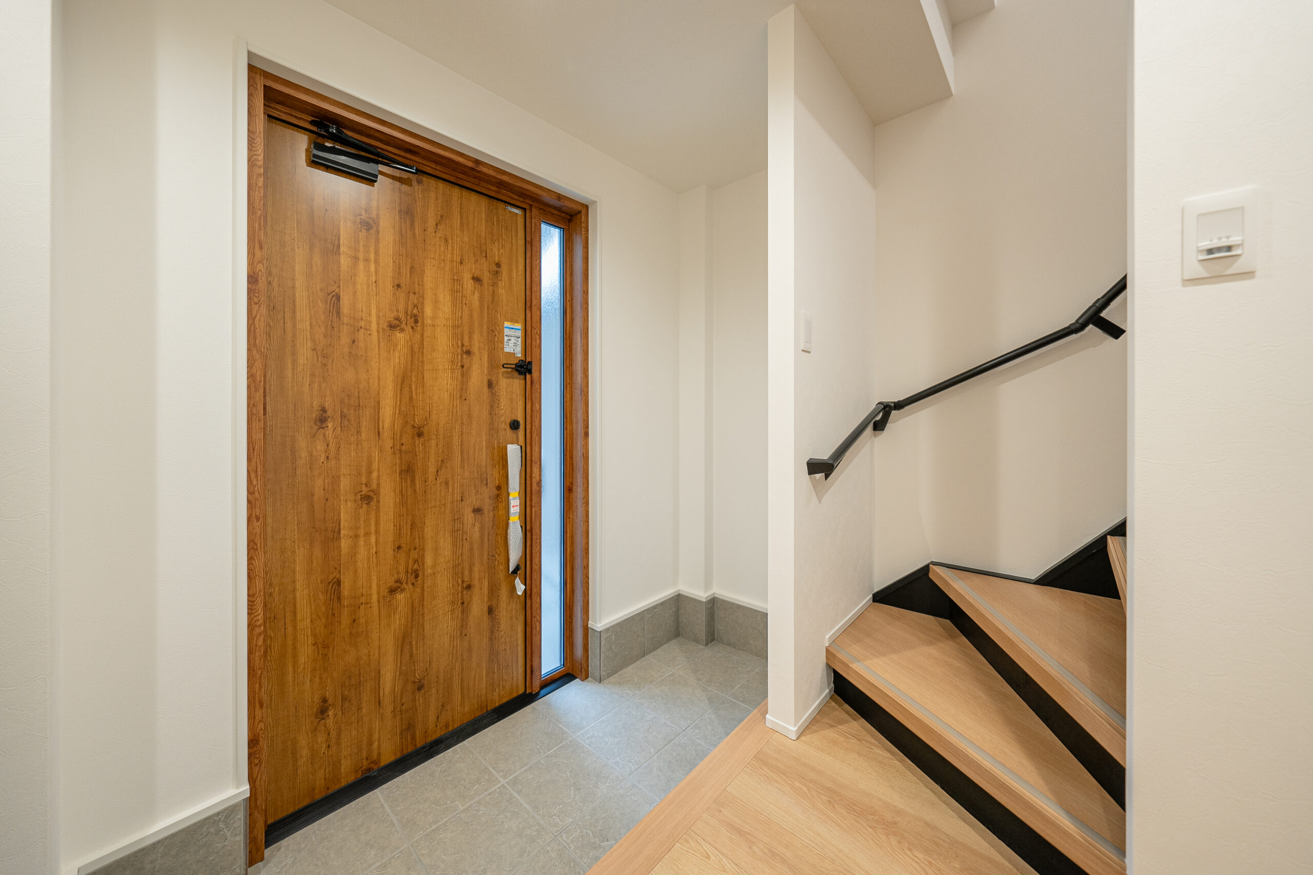 大きなエントランスドアに合わせ、広々とした玄関かまち。サイドの収納スペースは、ベビーカーや三輪車などを置く場所としてぴったり。