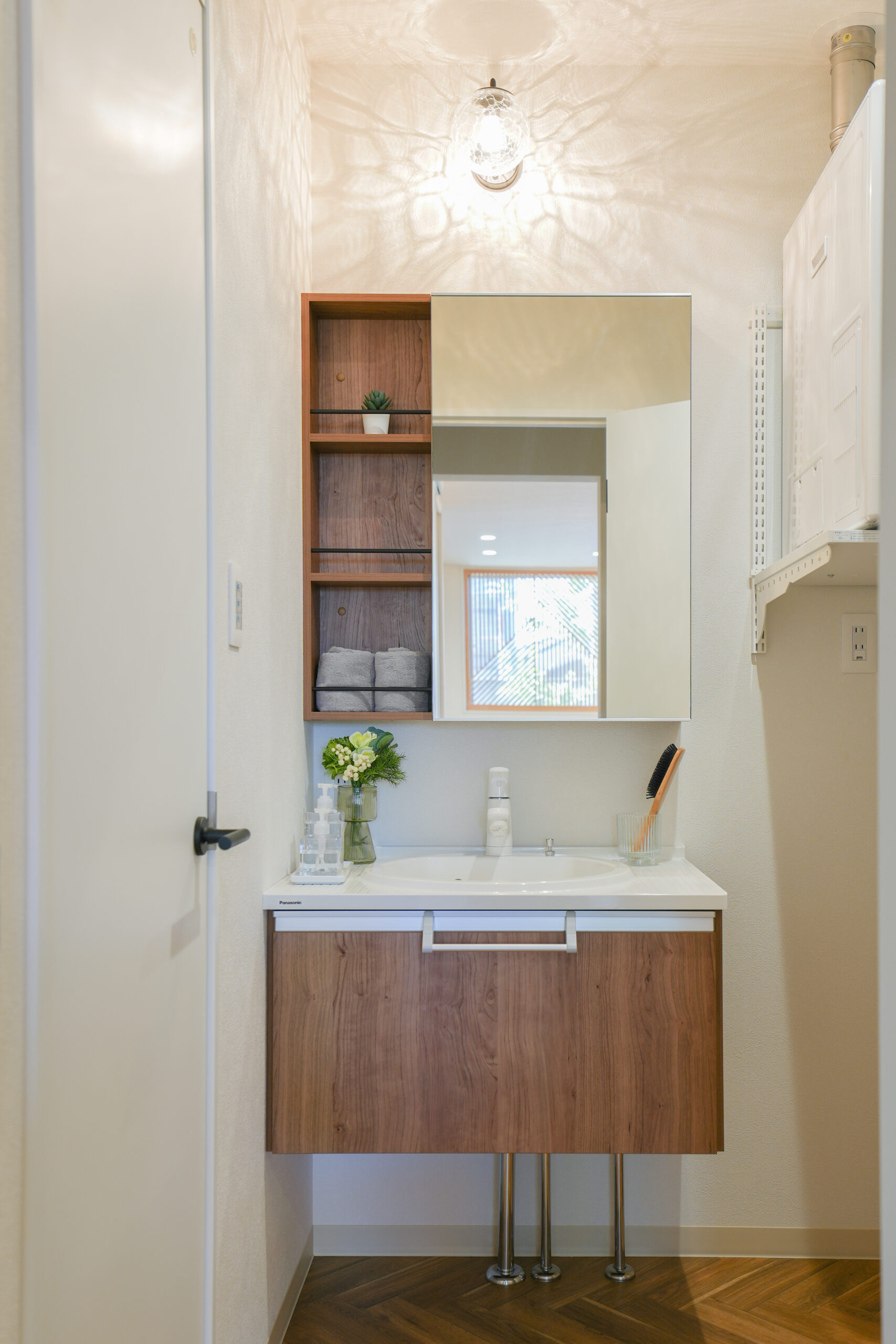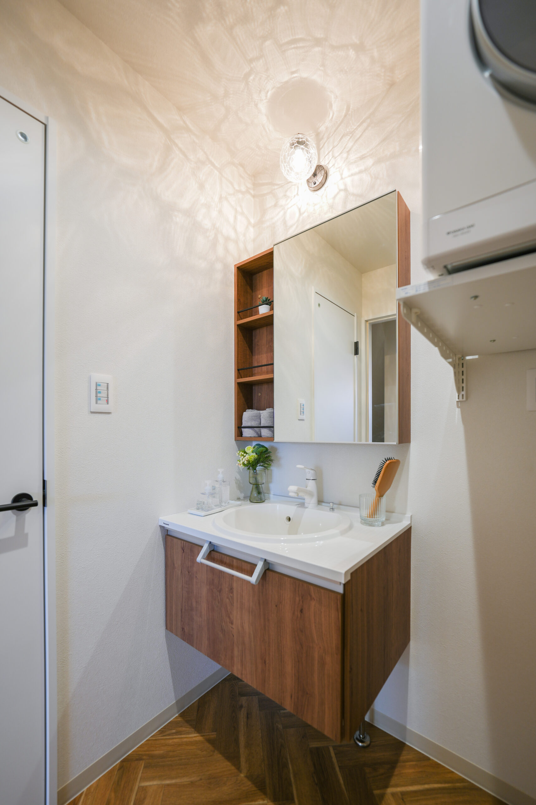 飾り棚の左側に位置する扉を開くと、洗面・洗濯・脱衣スペースへと続いています。