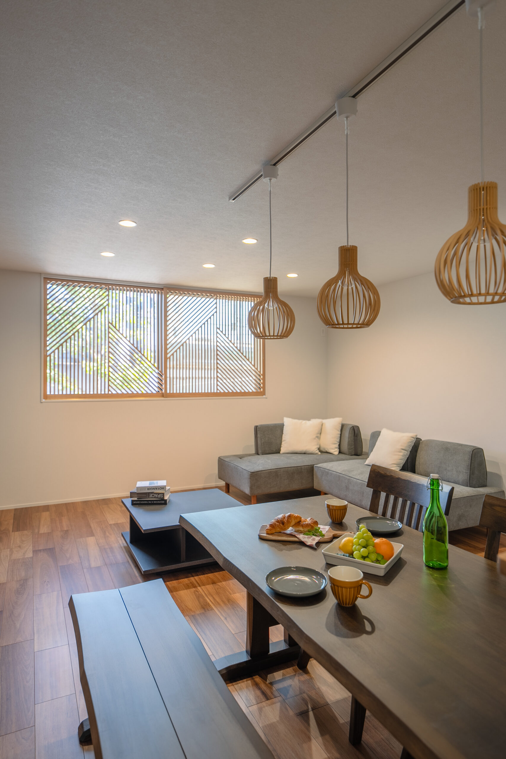 格子窓から差し込む光とペンダントライトの生み出す陰影とが、LDK全体に落ち着きと彩りを添えてくれます。