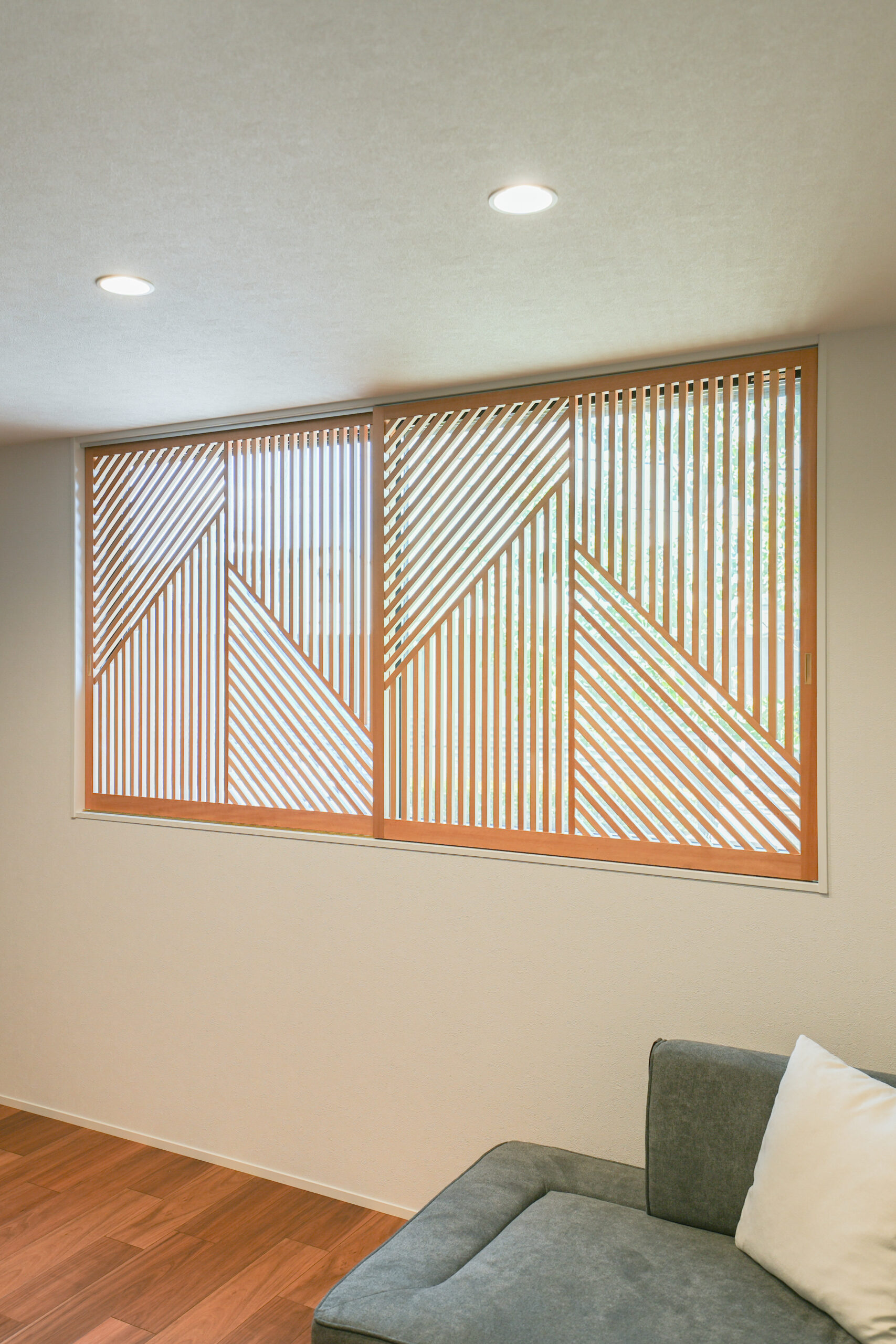 オリジナルの格子細工を施工した窓がリビングの印象を際立たせます。