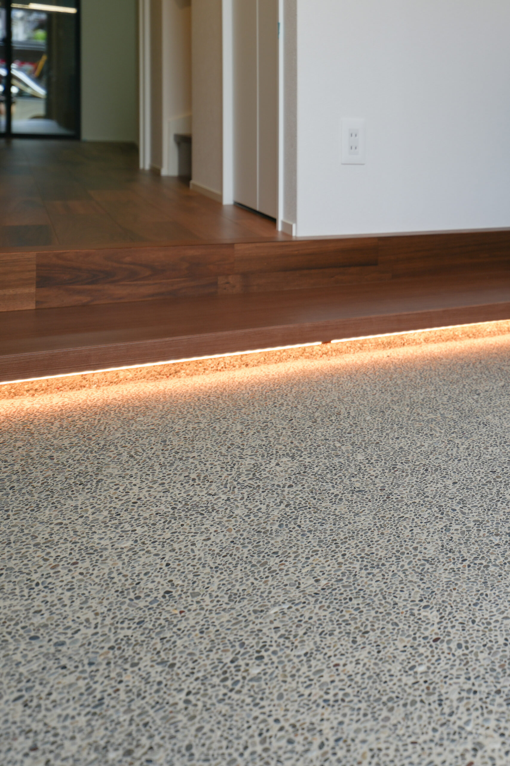 エントランスには、「洗い出し」という小石が散りばめられた左官の床を。