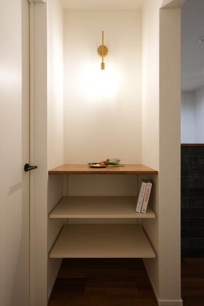 飾り棚に向かって右がLDK、左が洗濯脱衣室+浴室+W.C.なので、お出かけ時に必要な鍵などを置くスペースとしても活躍。