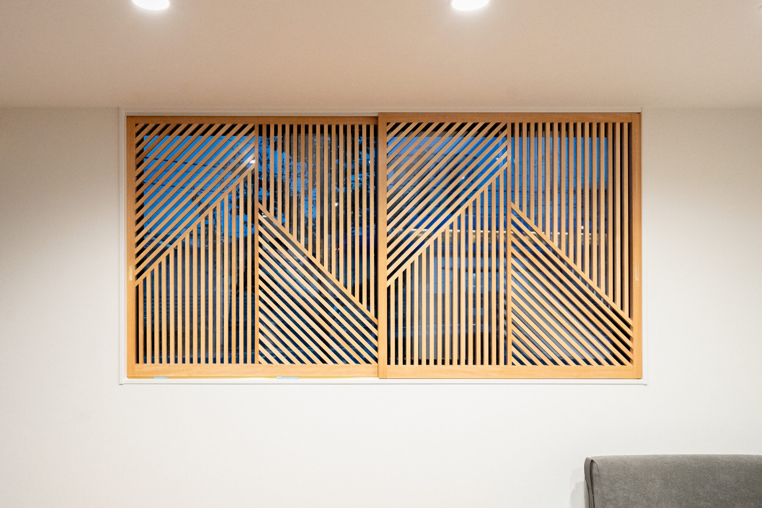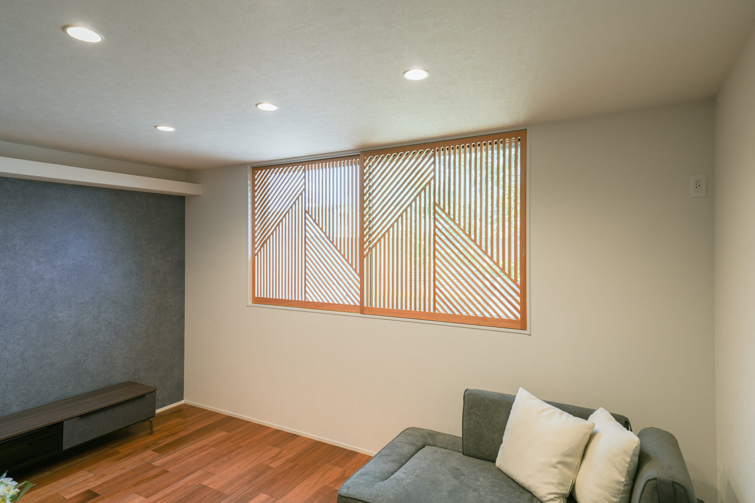 オリジナルの格子細工を施工した窓がリビングの印象を際立たせます。