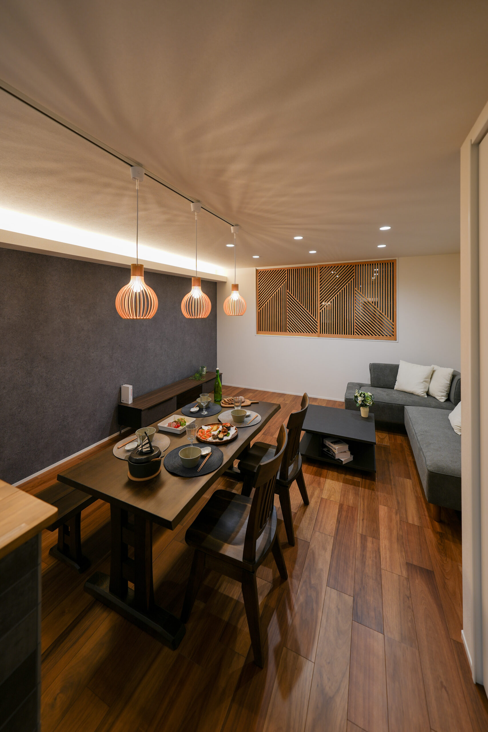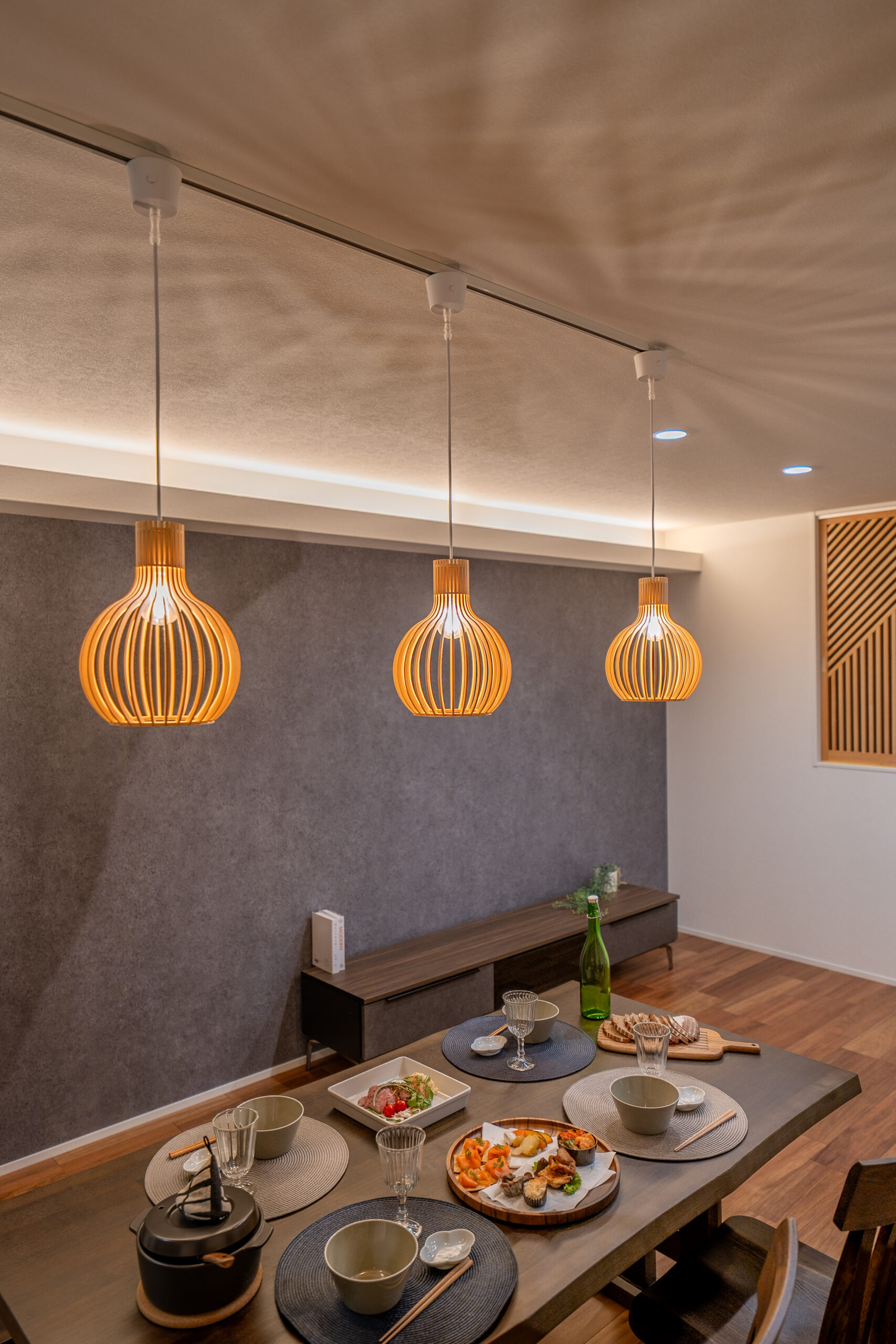 ダークグレーのアクセントクロス上部に設置された間接照明は、ダウンライトやペンダントライトと組み合わせることで、さまざまなムードの演出を可能にしています。