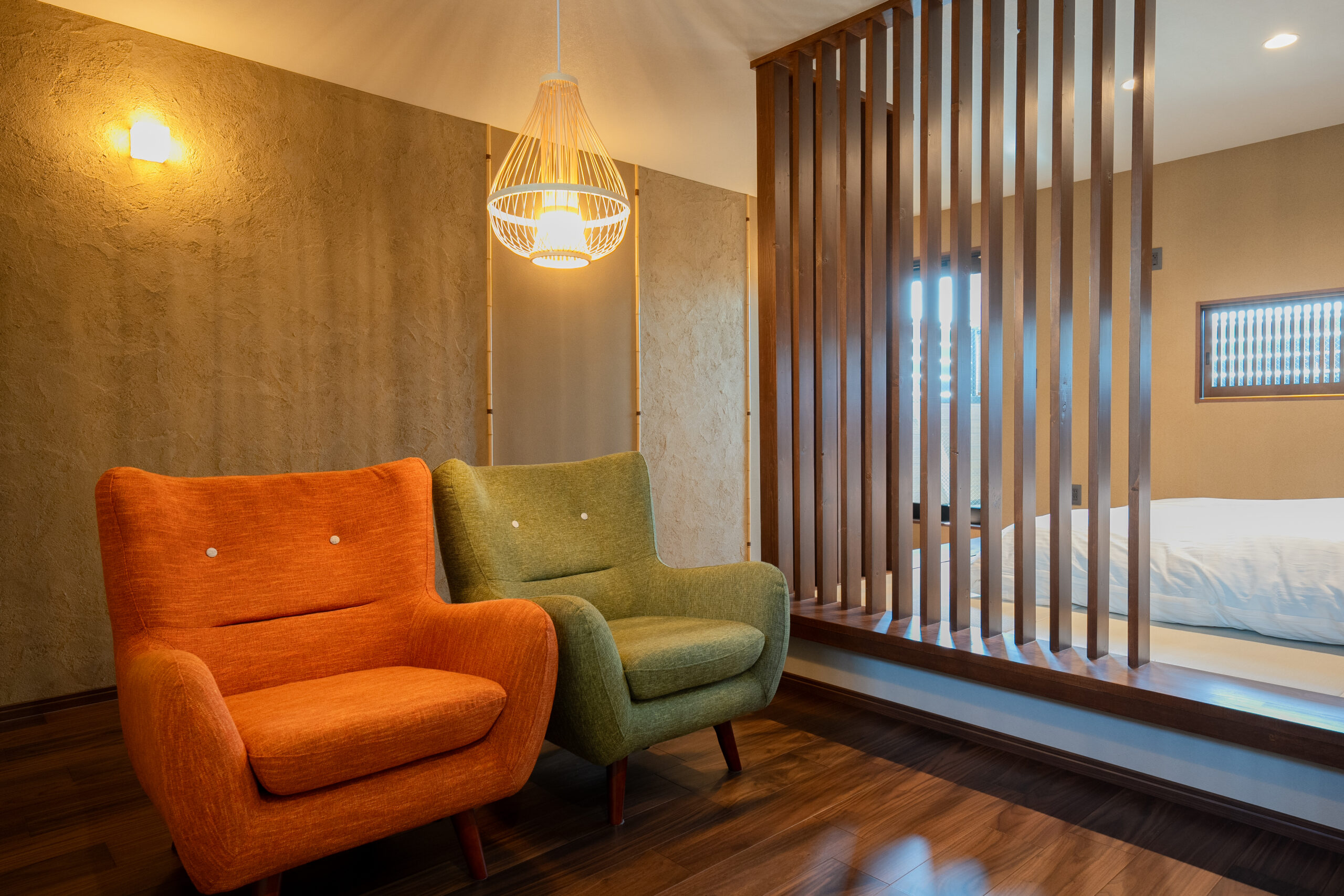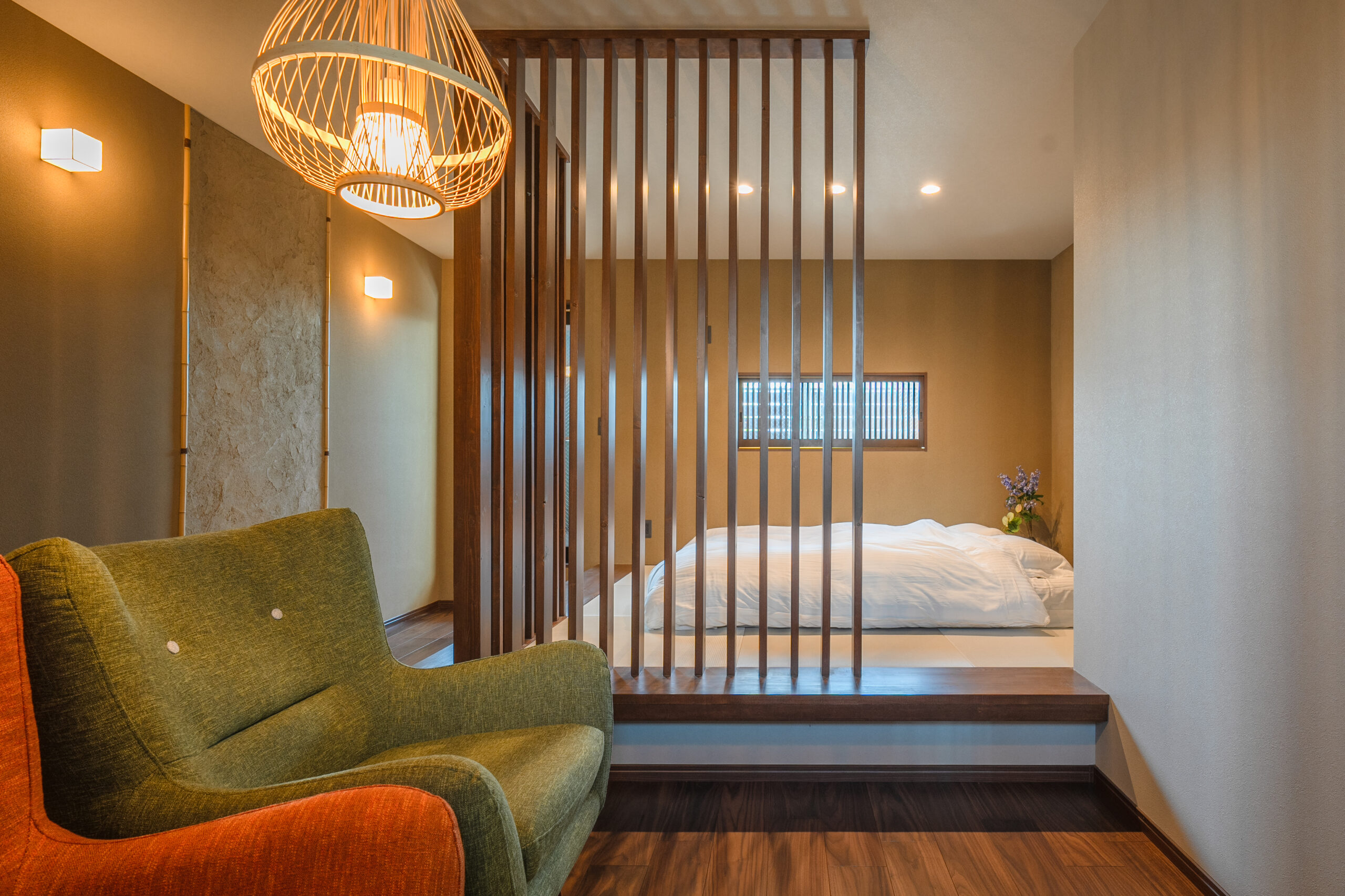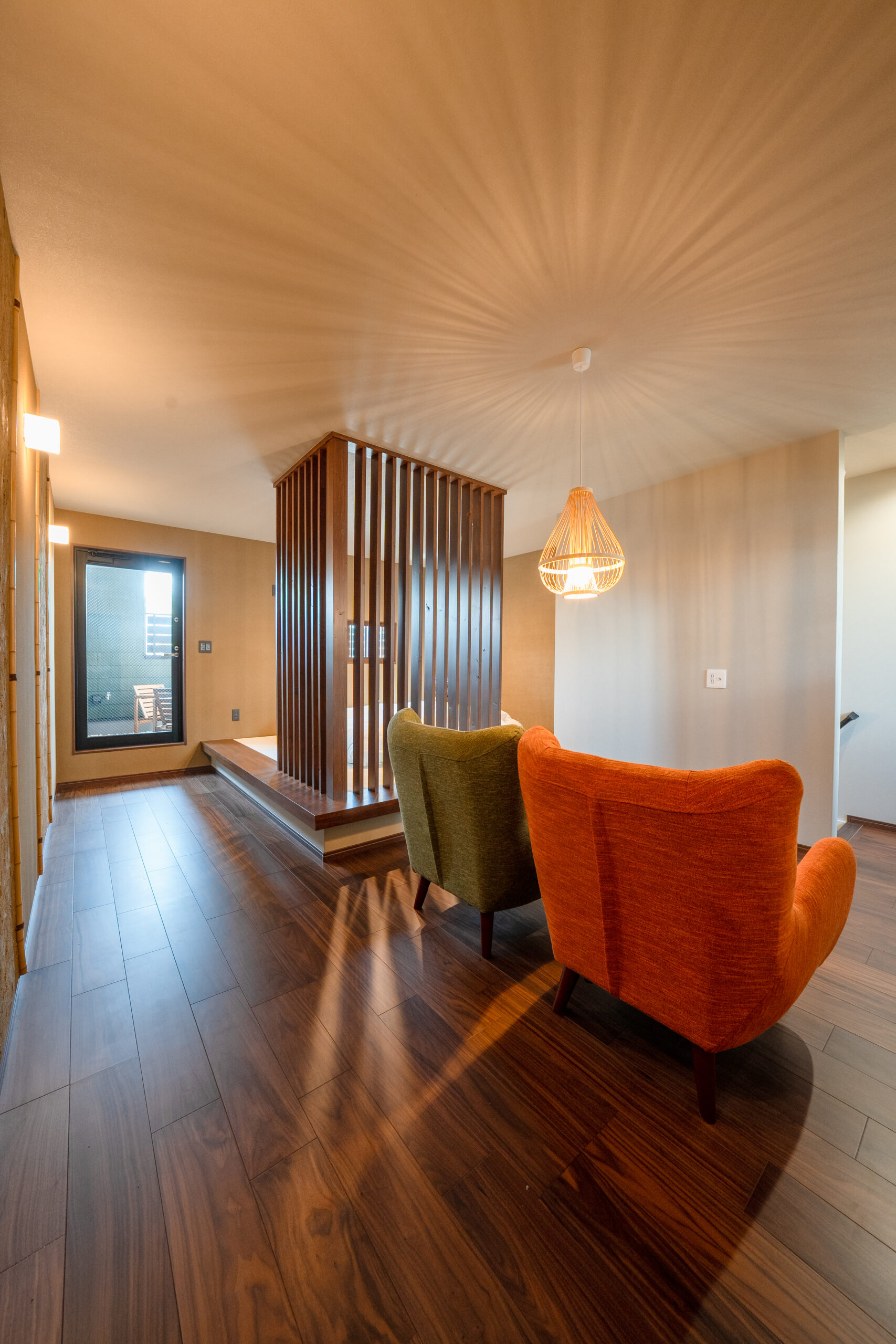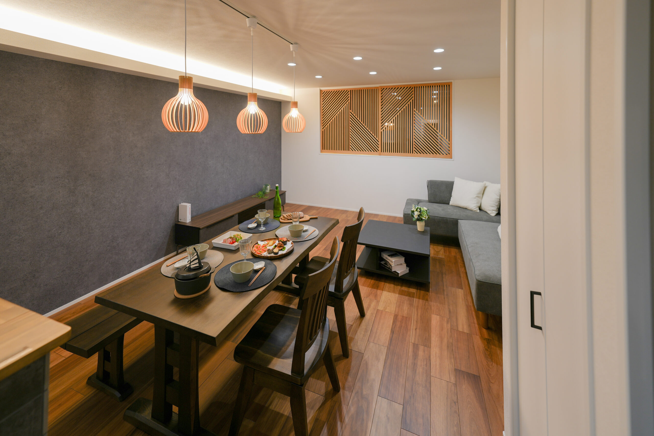 格子窓から差し込む光とペンダントライトの生み出す陰影とが、LDK全体に落ち着きと彩りを添えてくれます。