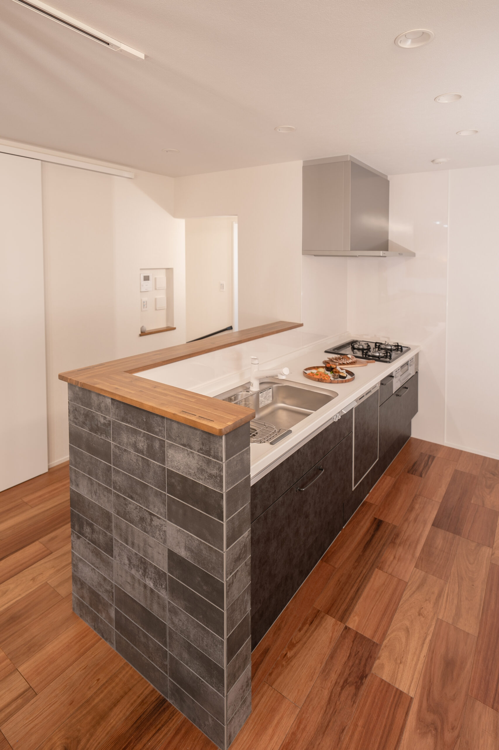 飾り棚に向かって右に折れると、リビングの手前にキッチンがあります。
