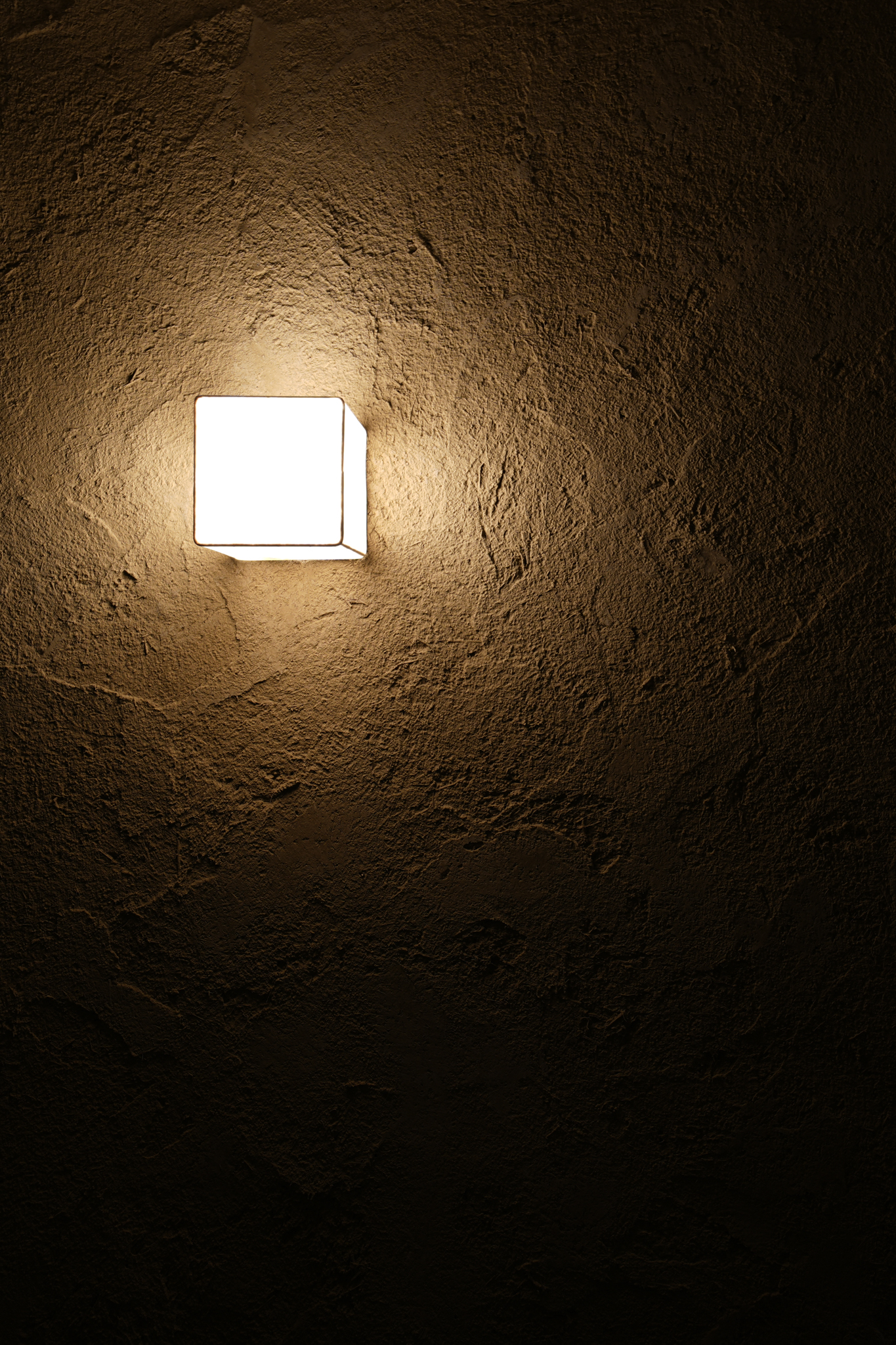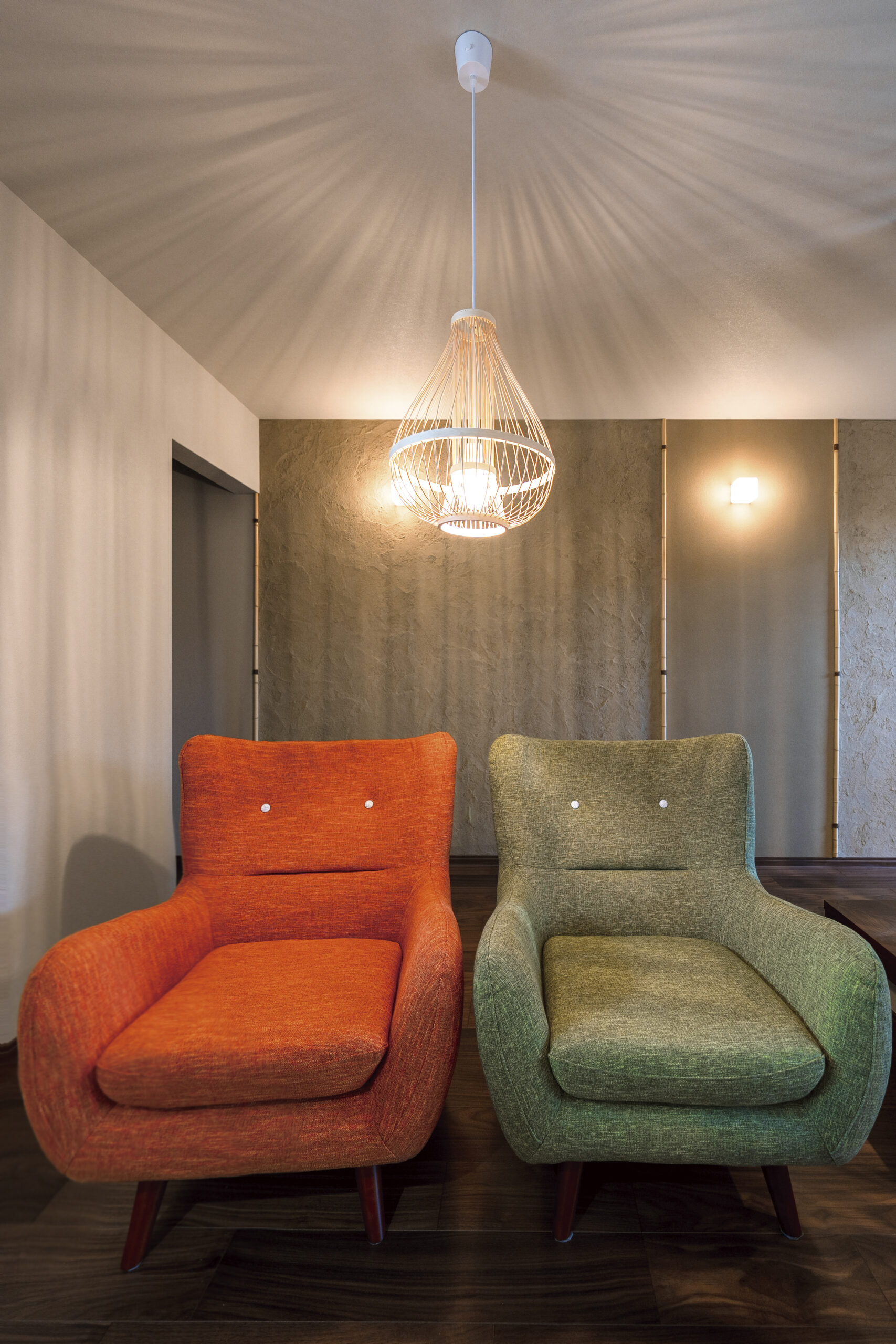 ヘリンボーン調の床と、ひび割れ感のある照明が、落ち着いたリラックスムードを演出しています。