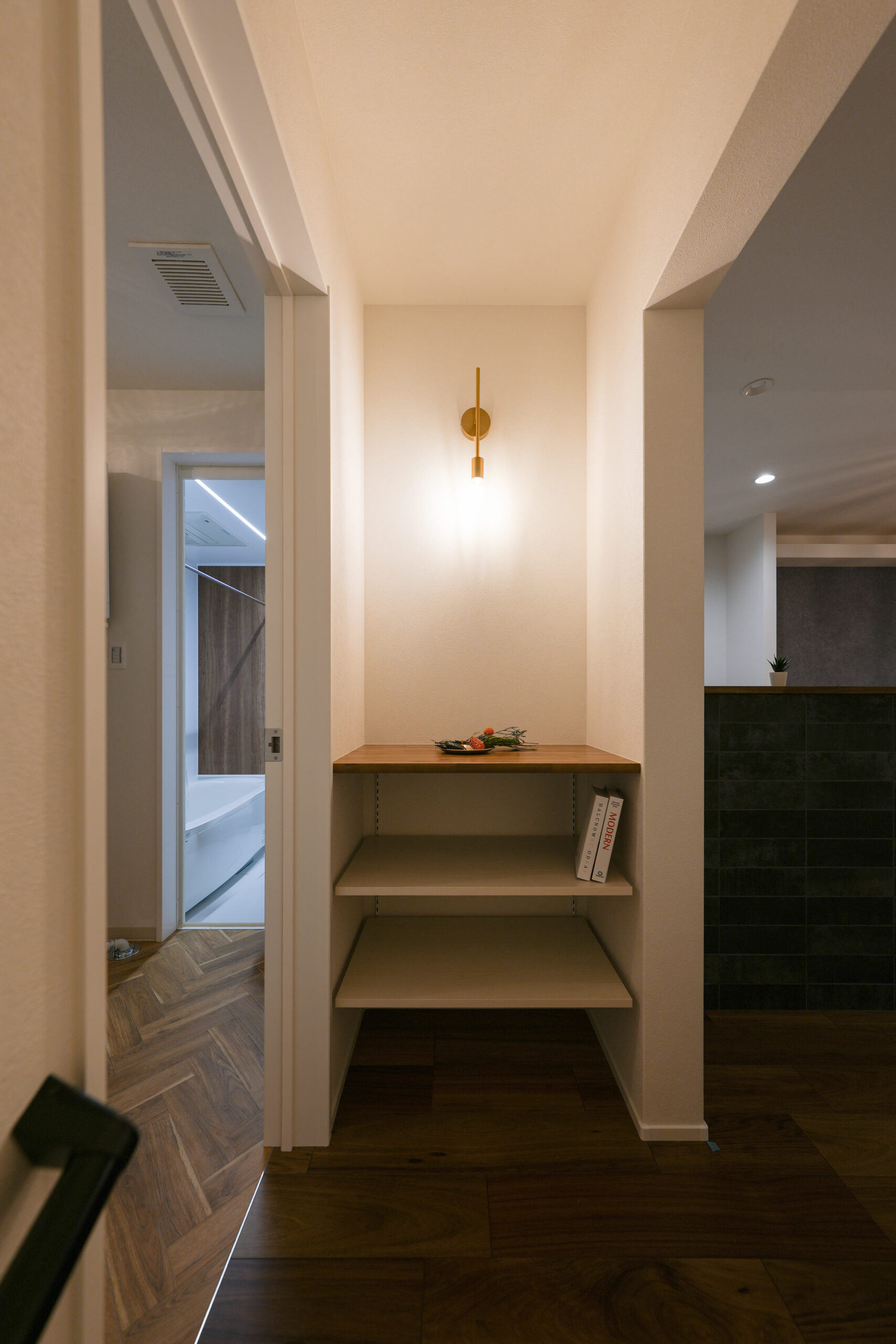 飾り棚に向かって右がLDK、左が洗濯脱衣室+浴室+W.C.なので、お出かけ時に必要な鍵などを置くスペースとしても活躍。
