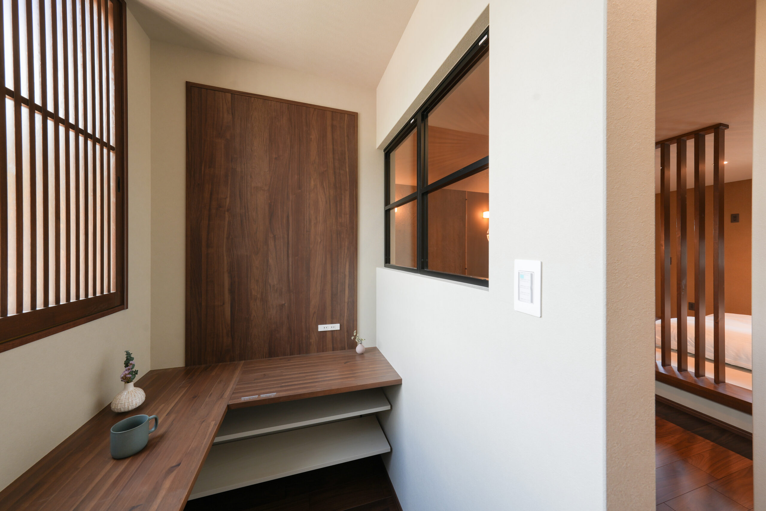 玄関全体に柔らかい光を演出する関節照明を配置し、訪れた瞬間に安心感を与える空間を実現。