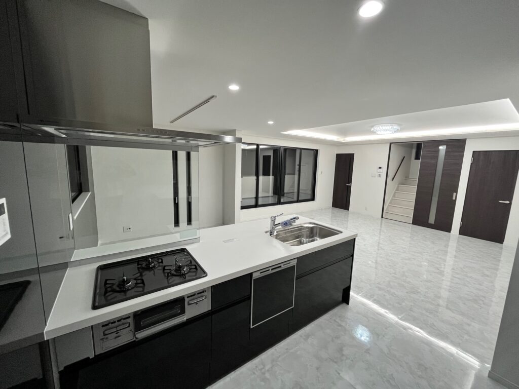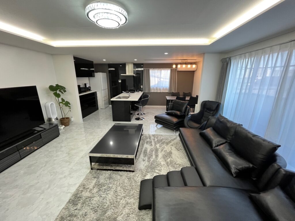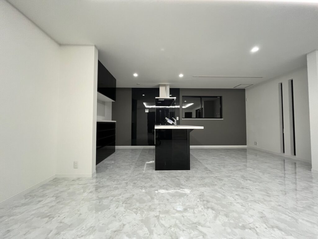 白と黑を基調としたスタイリッシュな内装と対照的に、ダイニングには暖色のライトをアクセントとして設置。