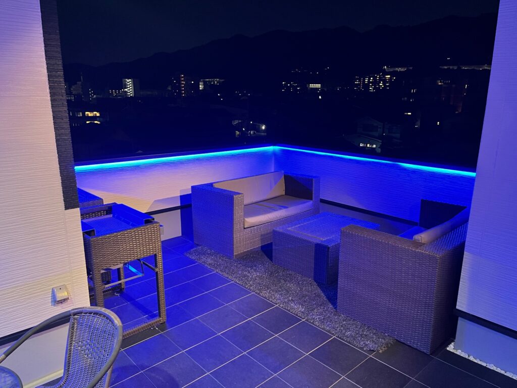 夜時間を楽しめるよう、手すり部分にぐるりとライトを設置。