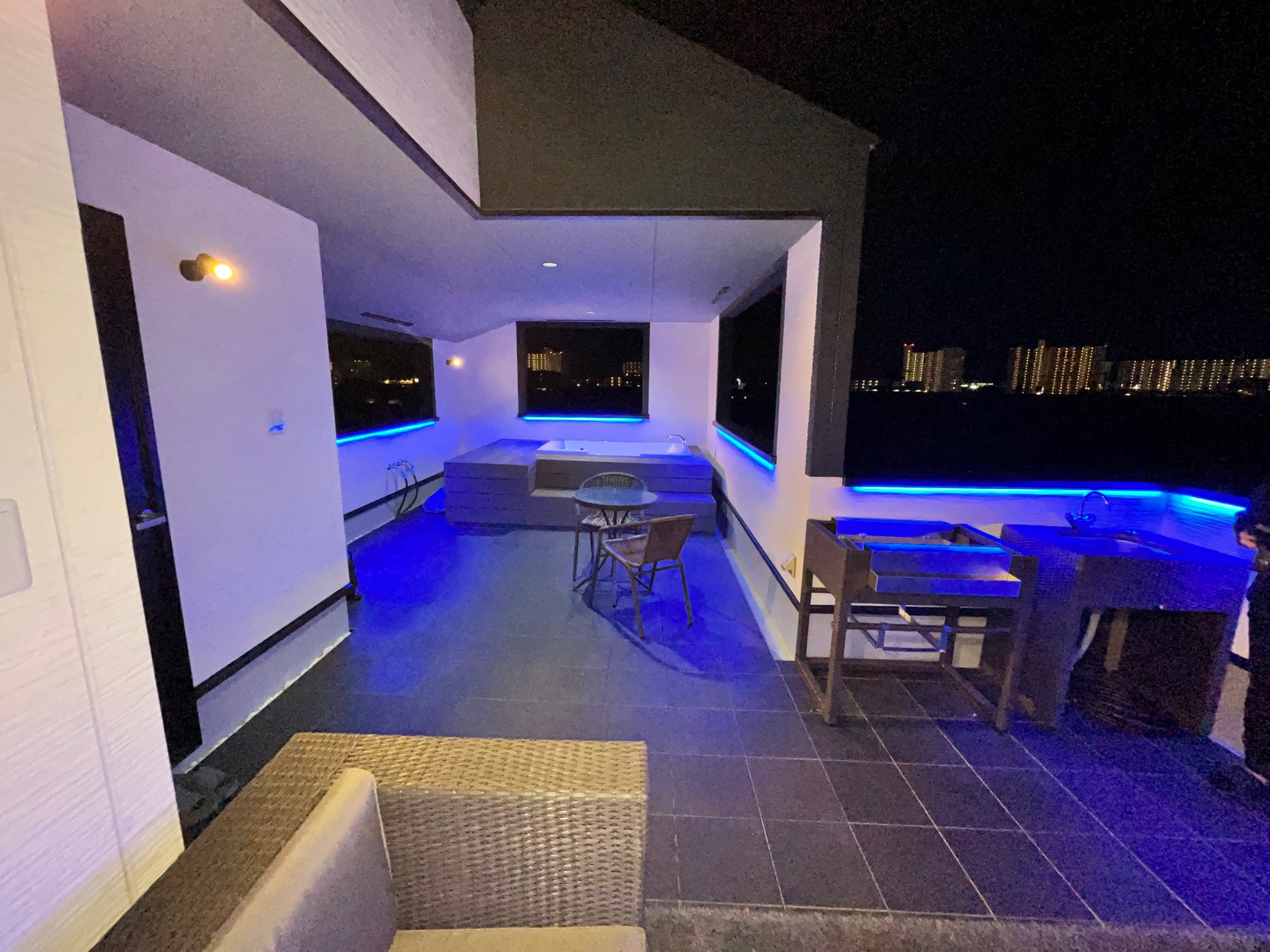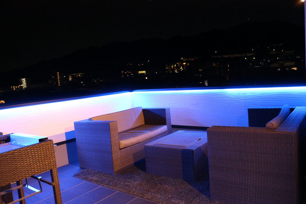 夜時間を楽しめるよう、手すり部分にぐるりとライトを設置。