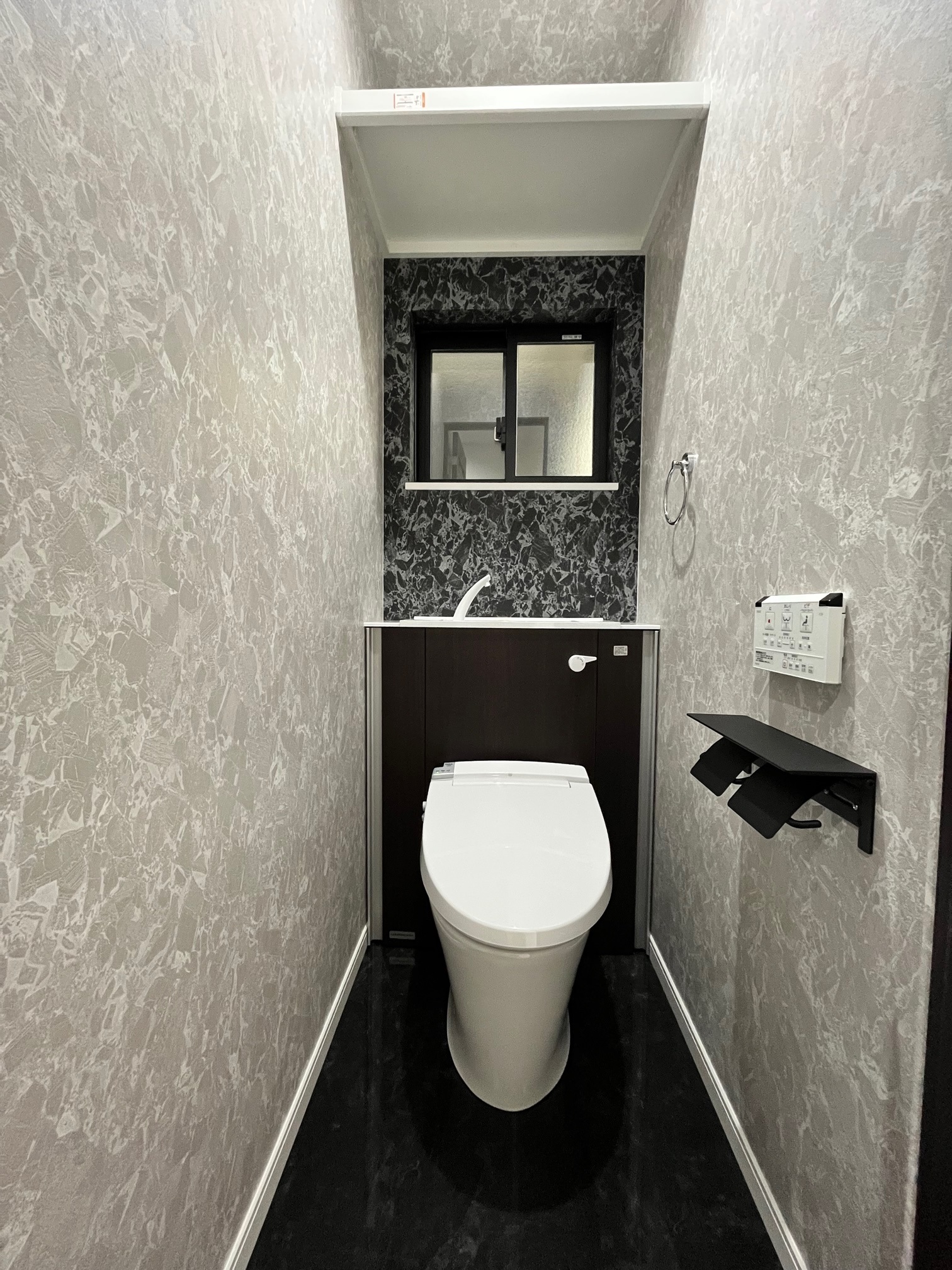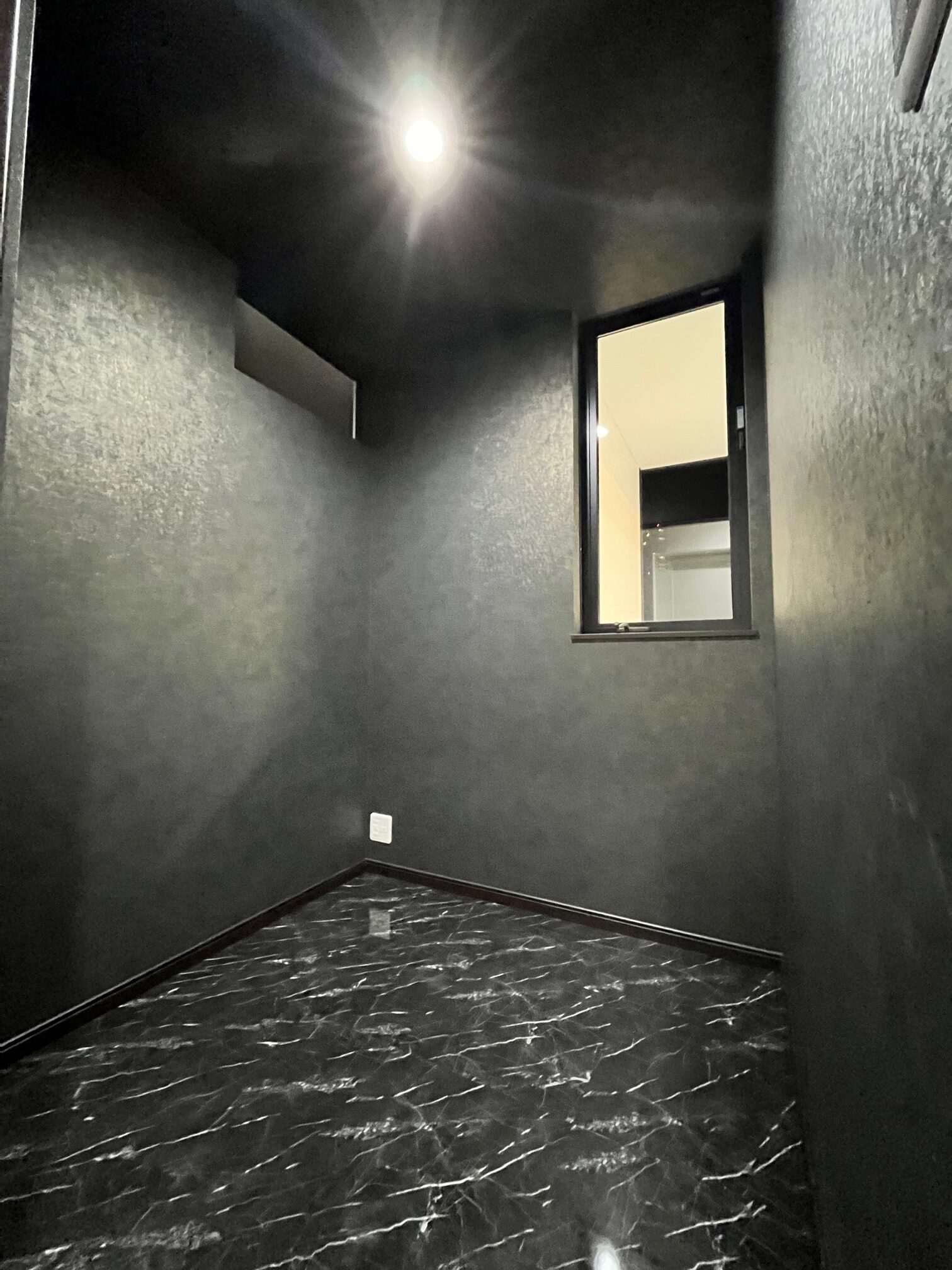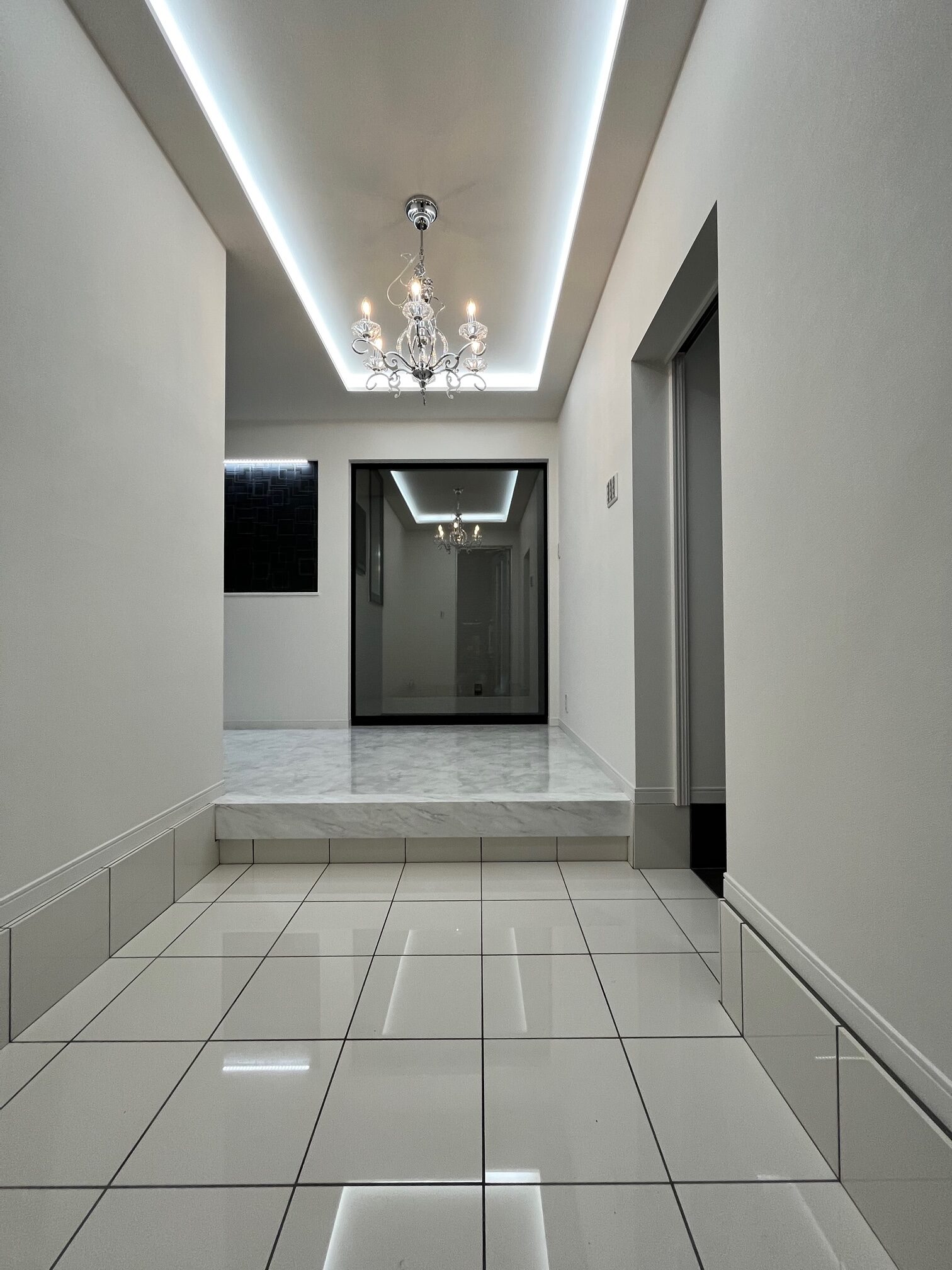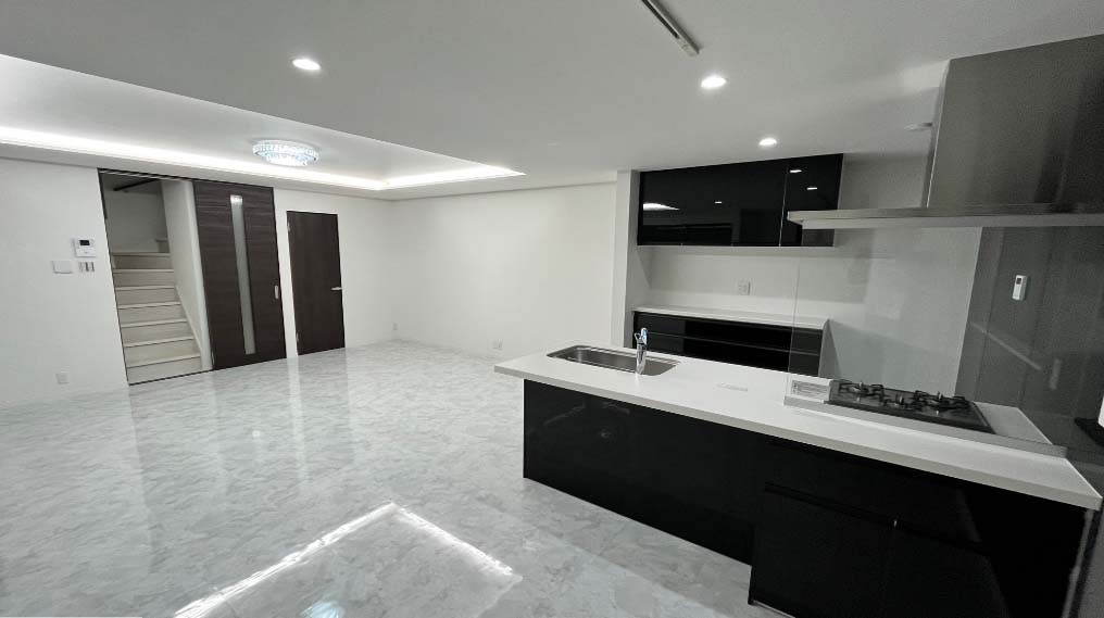 白と黑を基調としたスタイリッシュな内装と対照的に、ダイニングには暖色のライトをアクセントとして設置。
