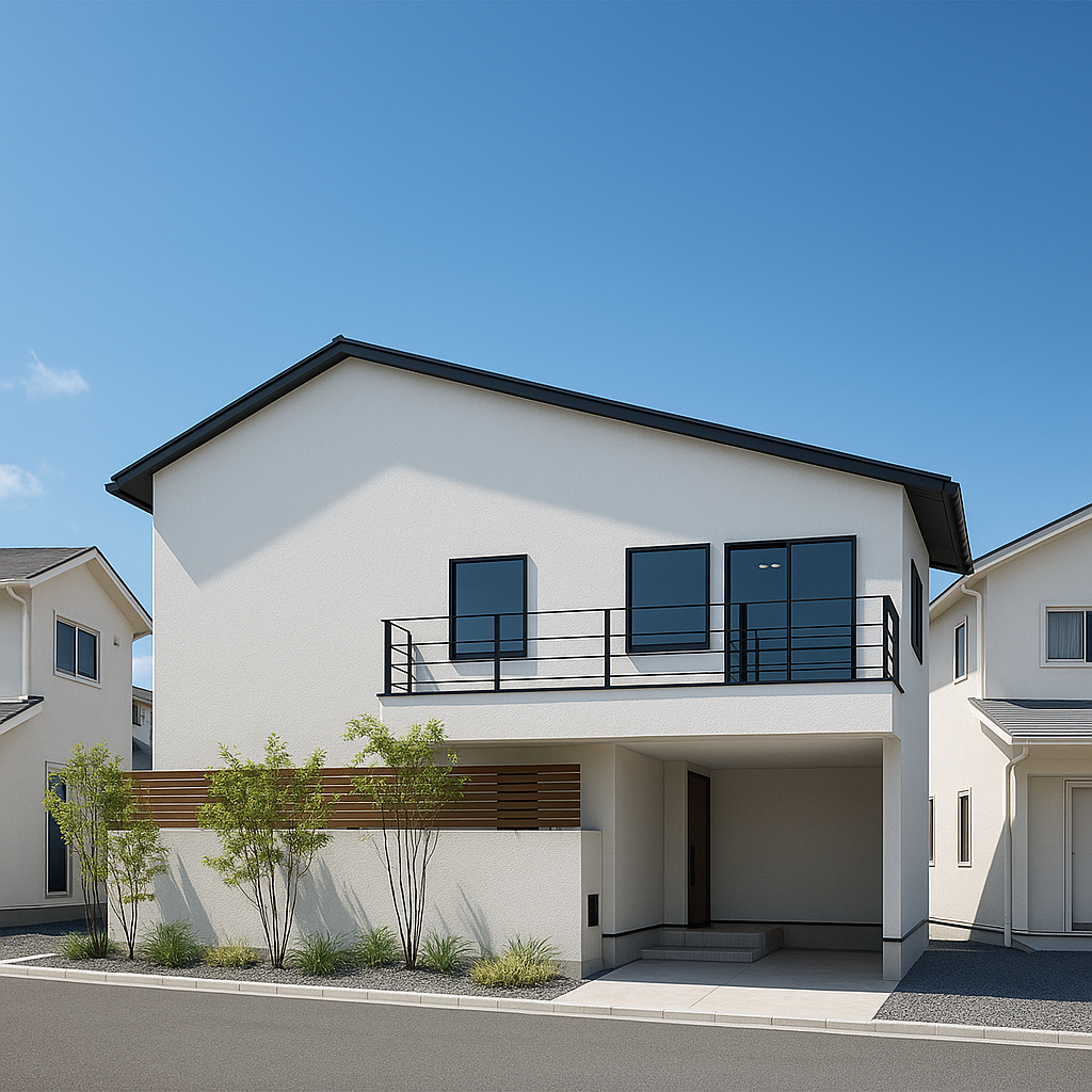バルコニーのアイアン手すりとダークウッドの垣根が、シンプルなデザインにアクセントを加えています。