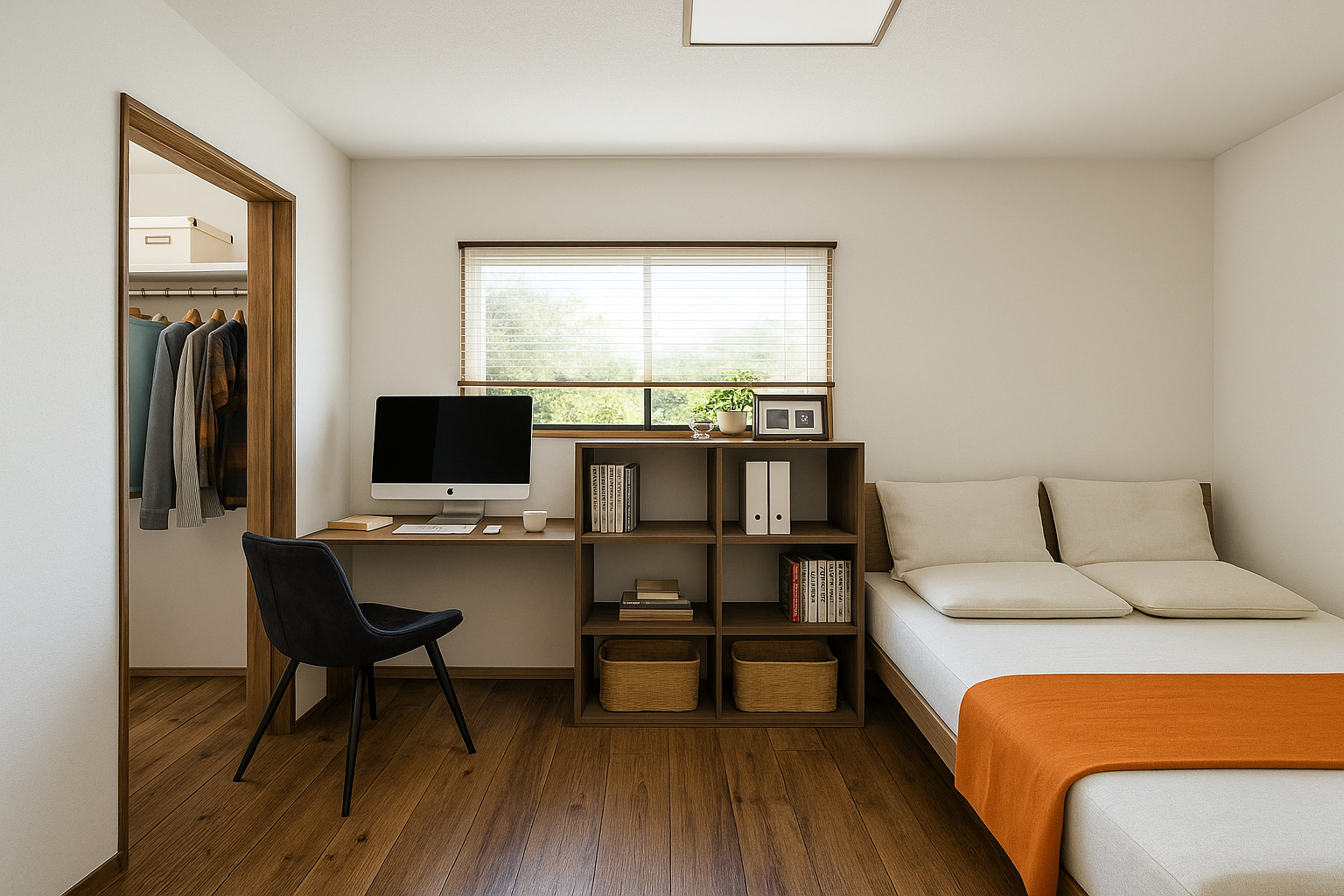 1.5帖のウォークインクローゼットを併設したコンパクトな生活スペースは、まるでホテル暮らしのよう。
