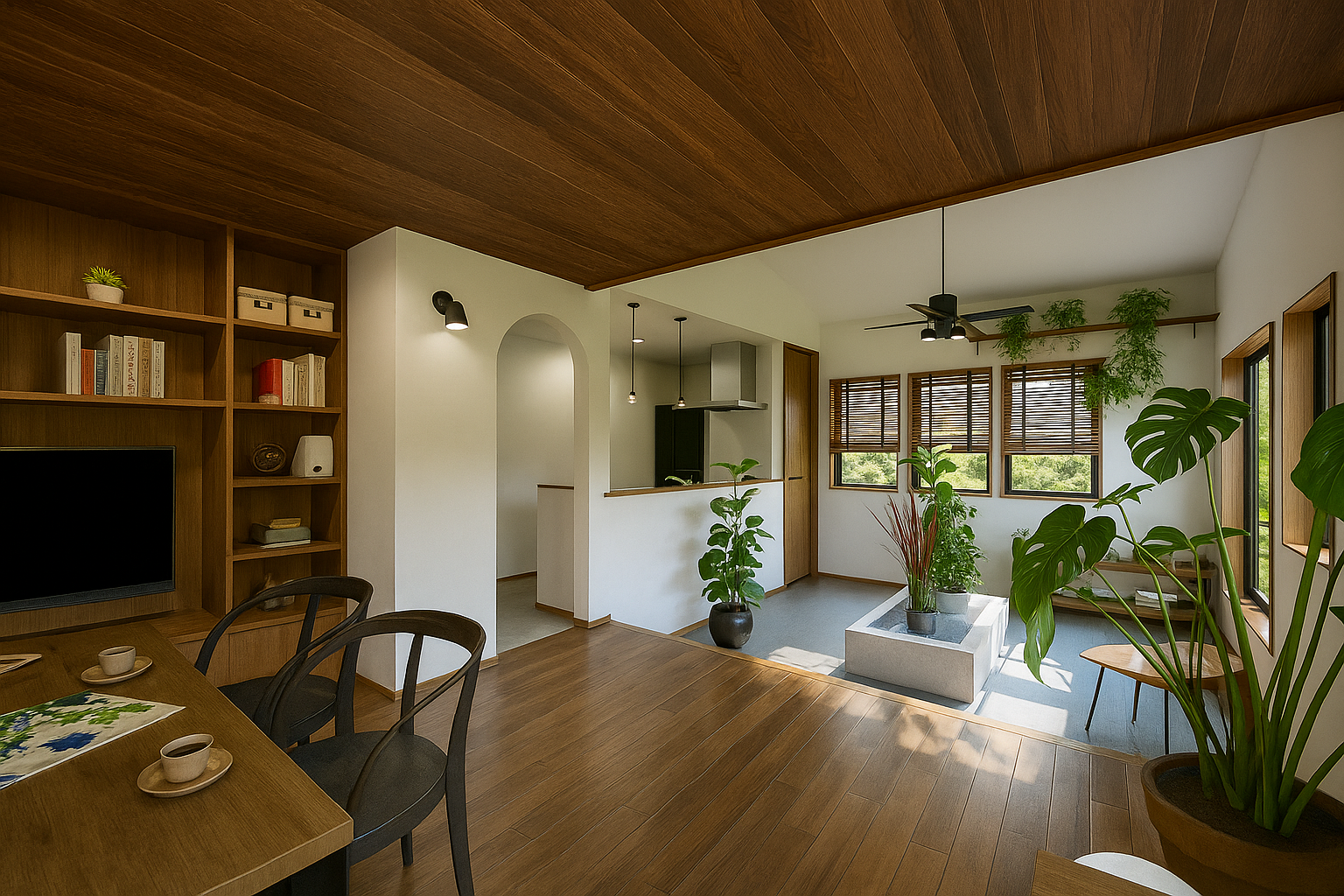 白とダークウッドの対比で、同じ空間にいながら二つの表情が楽しめるLDK。