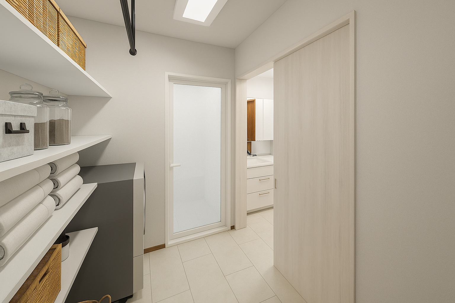 バスルーム&脱衣ランドリールームと洗面室の間には、引き戸を設置。