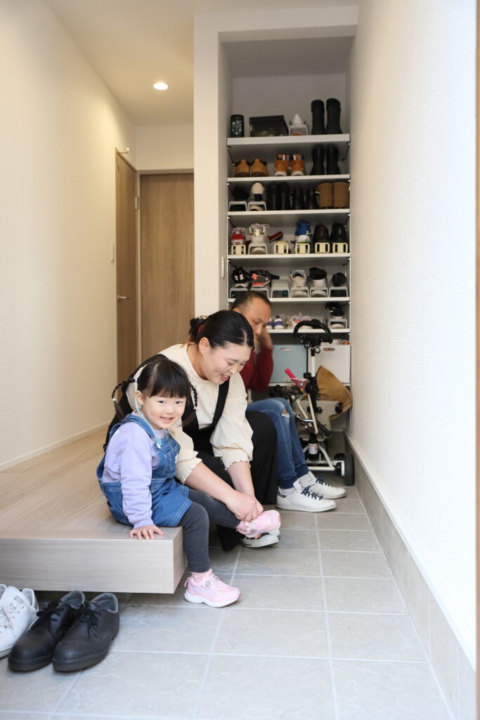 玄関は、出入りをスムーズにするためスペースを広めに確保しました。家族全員がそろって帰宅しても同時に靴を脱ぐことができます。以前の玄関は狭く、全員が一度に靴を脱げなかったので、いまはとても快適になりました。