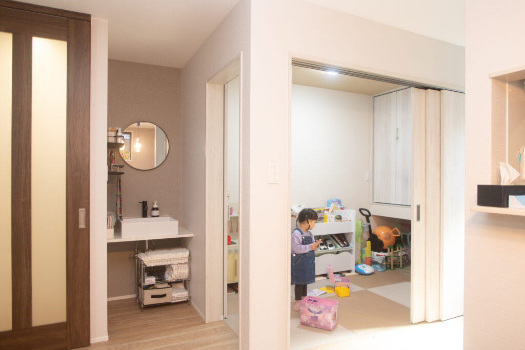 LDKの一角に洗面台や畳スペースを設けるなど、ライフスタイルに合わせた快適な間取りを実現されました。