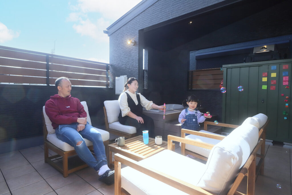 奥様:テラスがあることで、部屋着のまま外で過ごせるようになりました。家の中にいるのと同じ感覚で屋外空間を楽しめるのは特別感があります。
