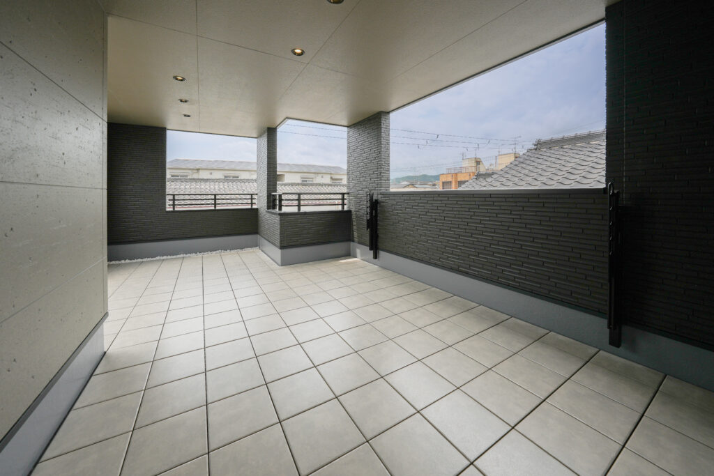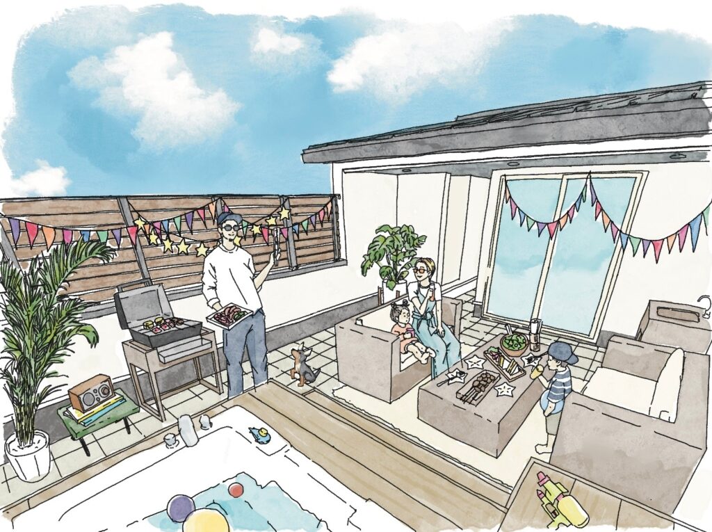 ご主人様:3階のテラスです。家族みんながゆったりと過ごせるように、広々としたスペースを確保しました。
