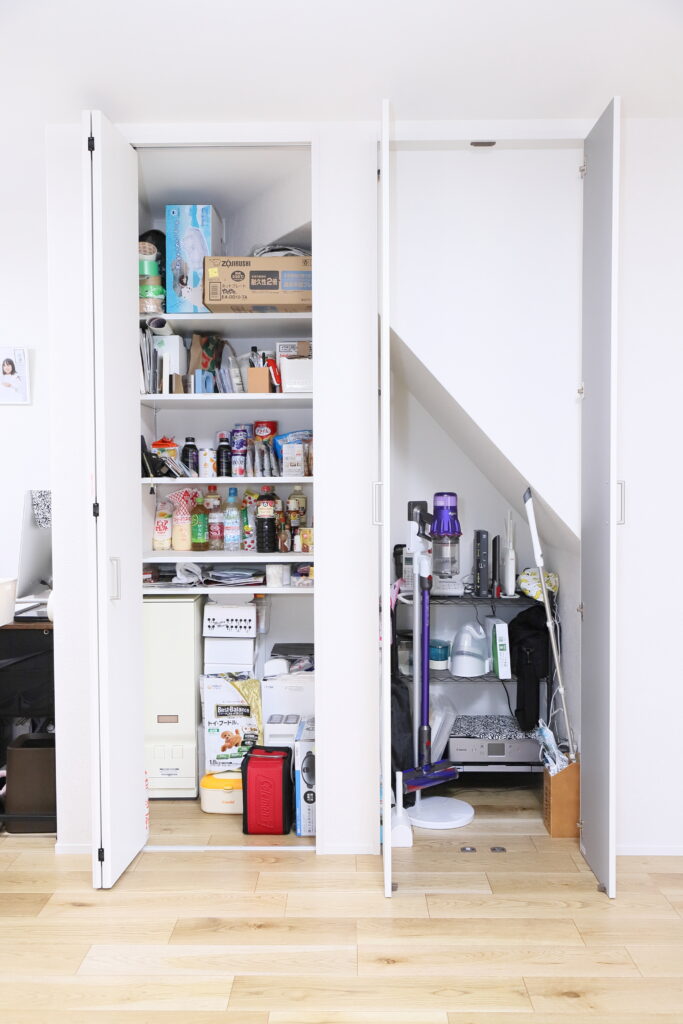その隣にも収納を作り、米びつや調味料のストック、文房具などを入れています。以前はキッチンやリビングに置いていた細々したモノを置けるので、空間をすっきり保てるようになりました。
