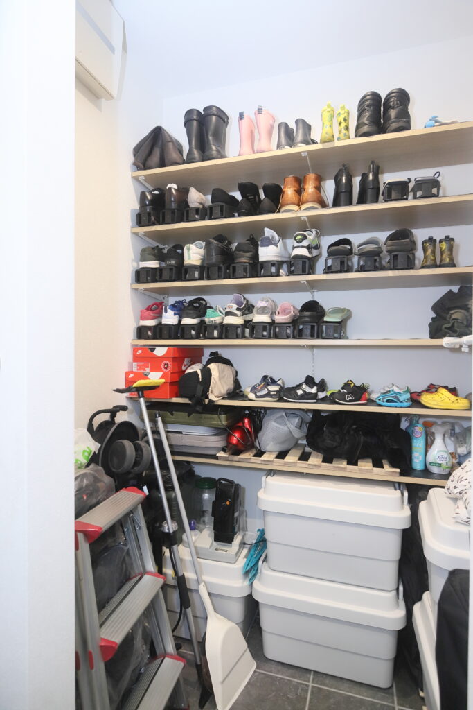 収納量が多いので、靴やベビーカーはもちろんのこと、脚立や掃除用品、キャンプ用品なども収まります。