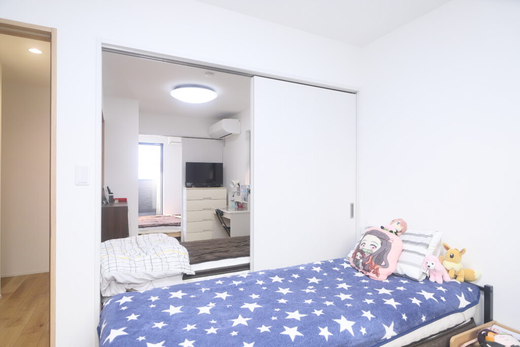 一方で、娘たちの部屋は間仕切りで区切っているため、扉を開けている日もあります。1人になりたいときは閉め、寂しいときは開けるといった具合に、プライバシーを保ちながらも姉妹のコミュニケーションを楽しんでいるようです。