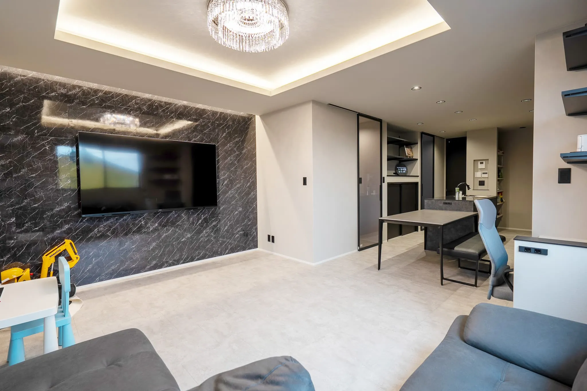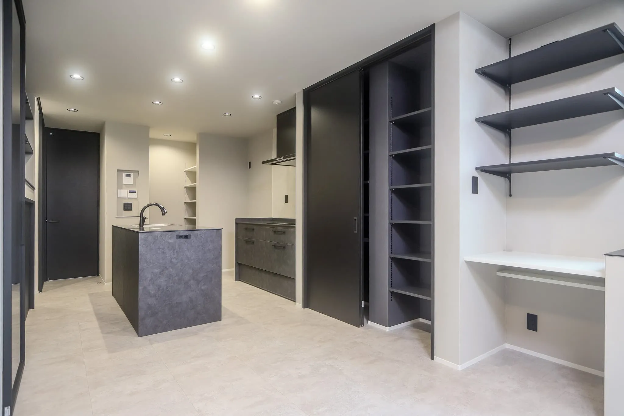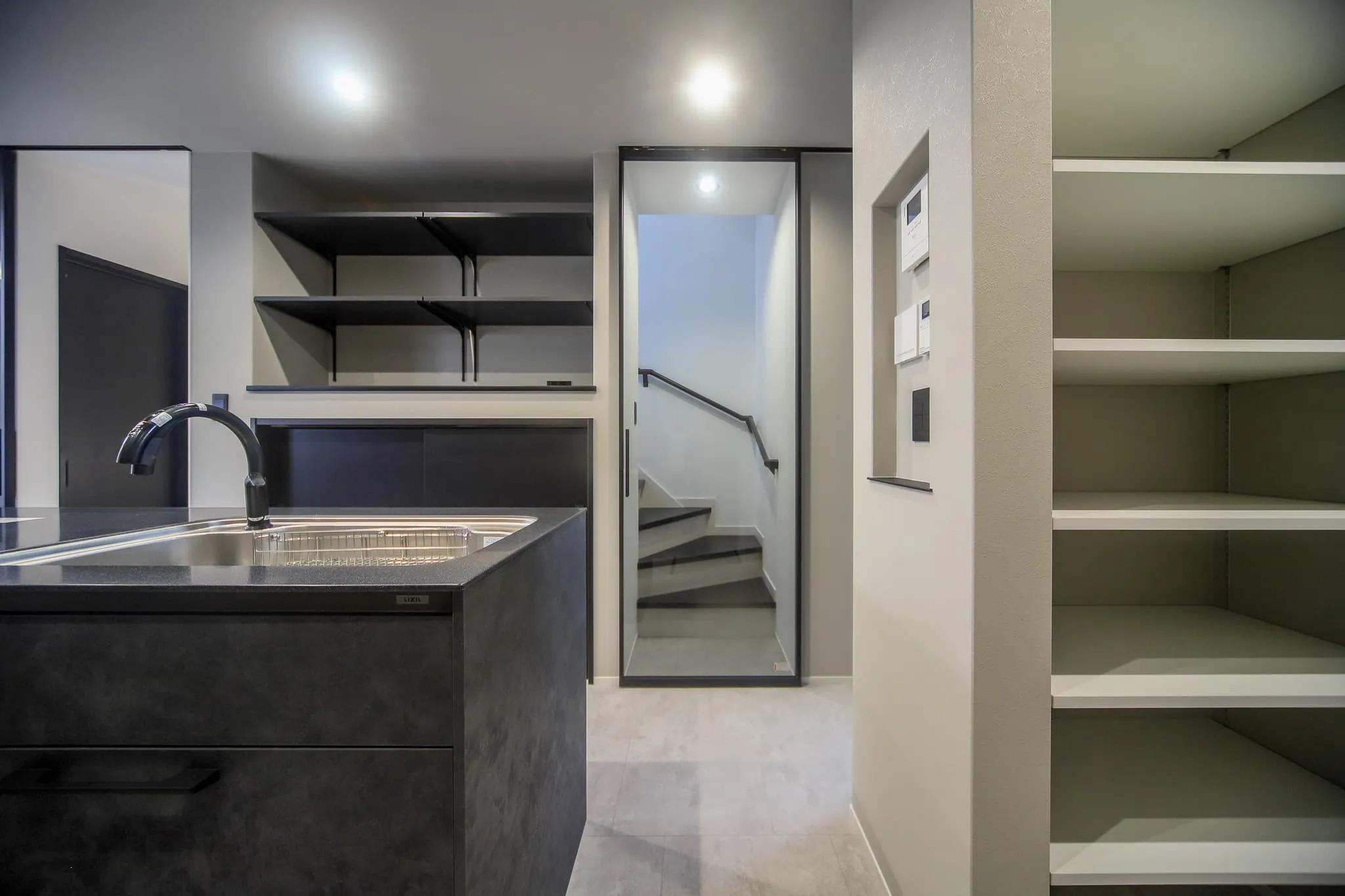 木目のない黒・グレー・白でまとめられたデザインにガラスの扉を取り入れられるなど、ホテルライクでおしゃれなお住まいが完成しました。