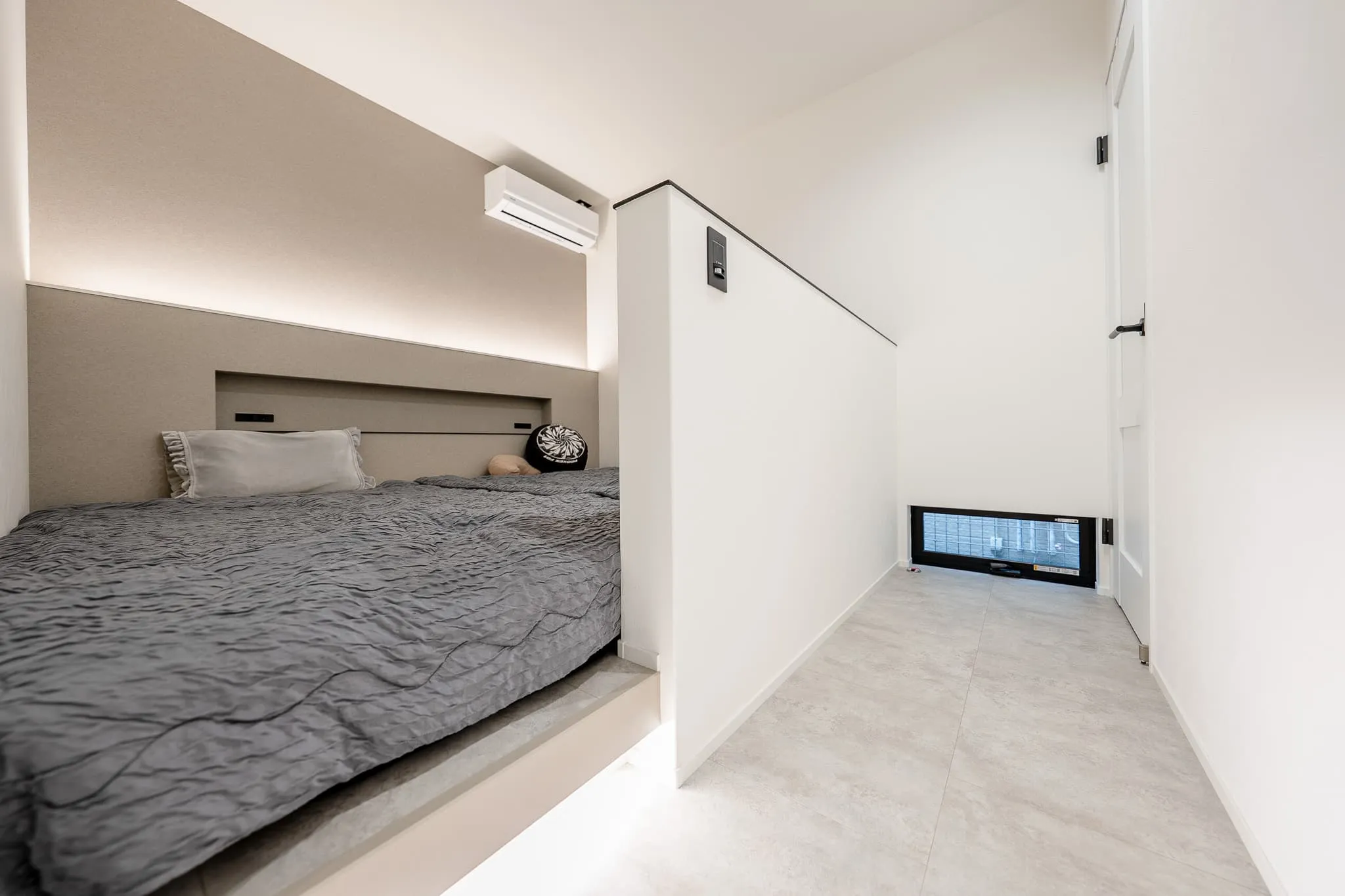 寝室は、ご夫婦とお子様で一緒に眠れるよう広い小上がり空間を設けました。