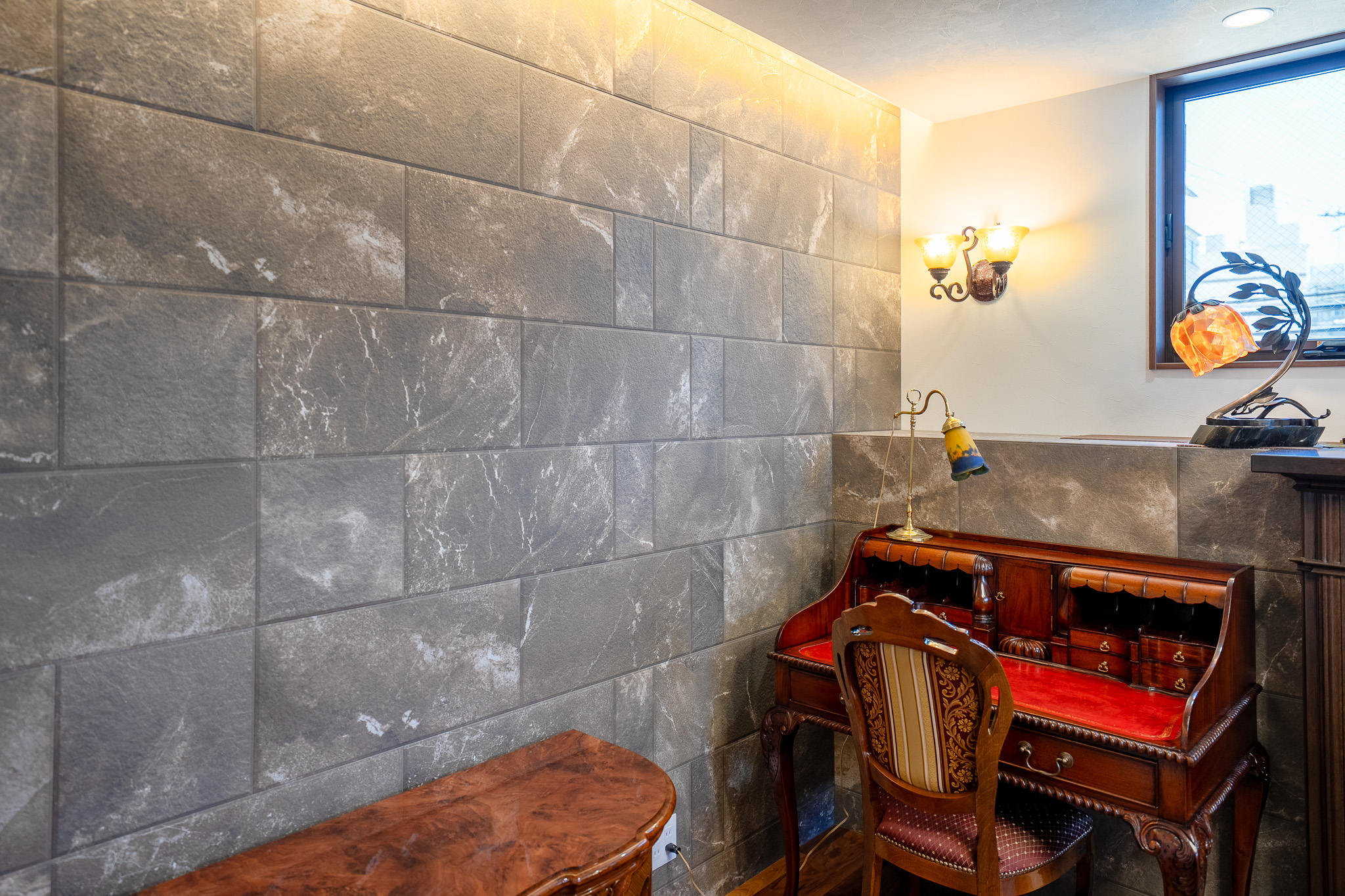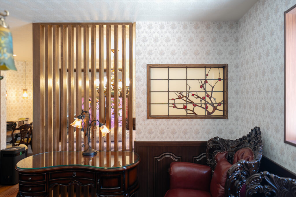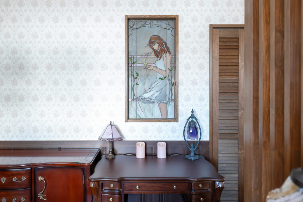 この空間は、U様が大切にされているステンドグラスを壁にあしらっています。